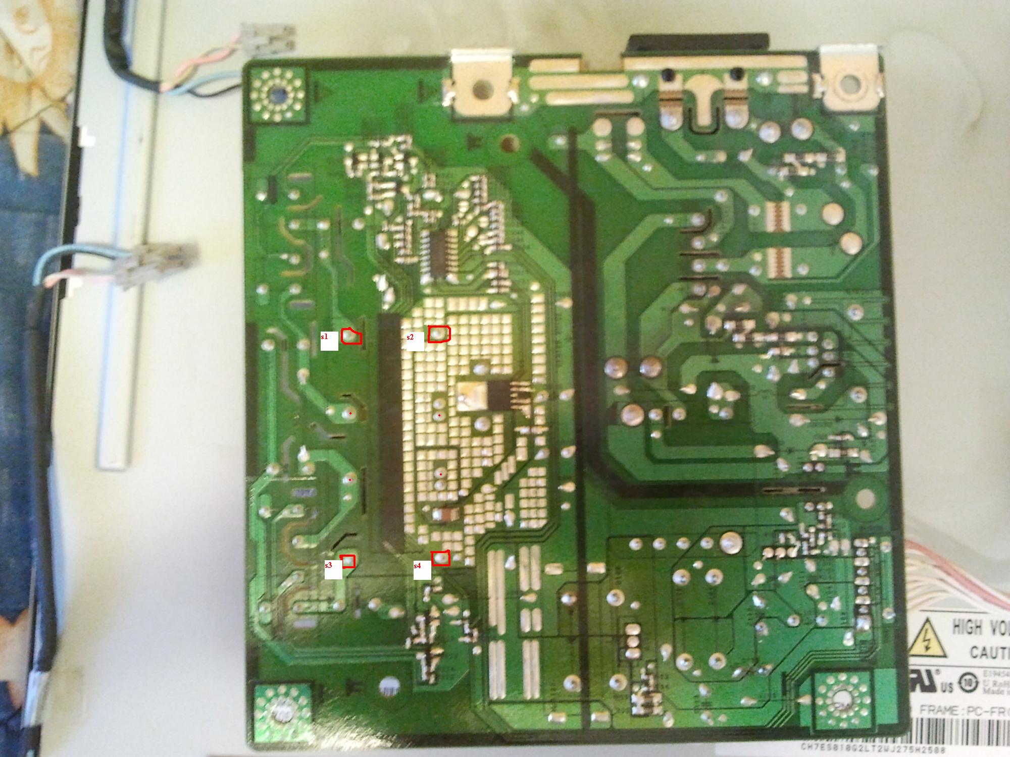 Great - that more like it - On th eback of the power board between where I marked S2 and S4 there is a component with 4and half legs can you make out a part number on it?
