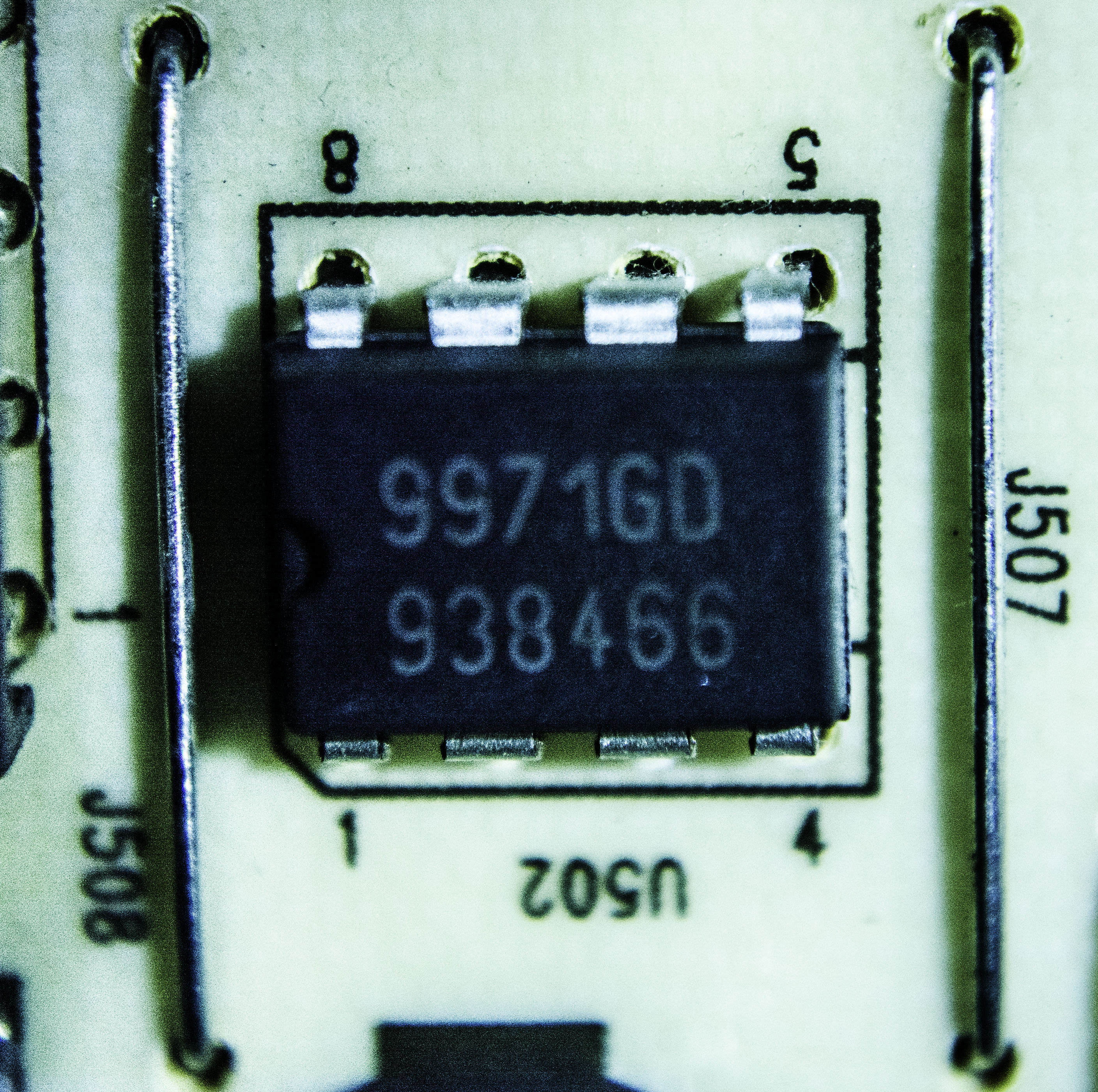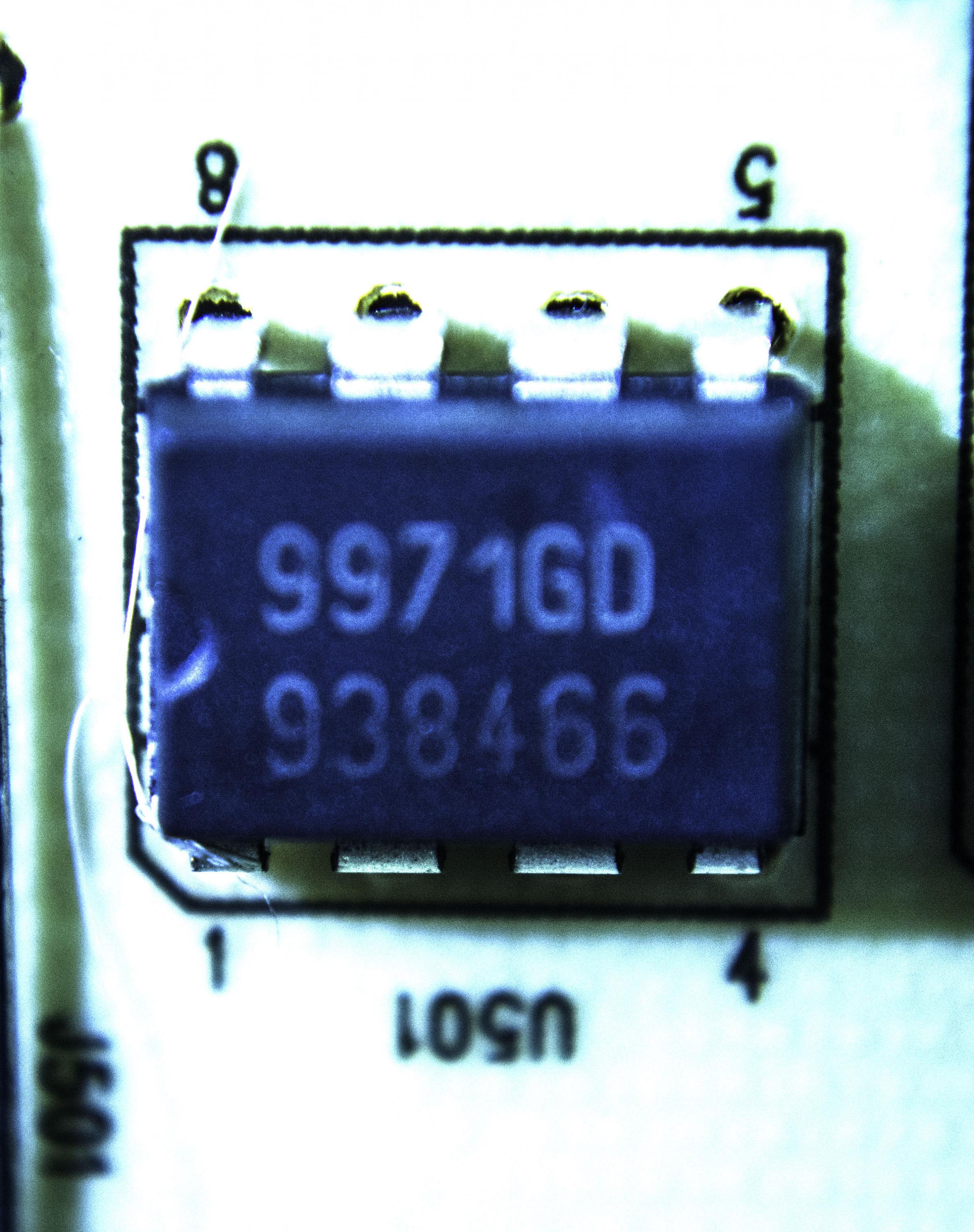 I checked both boards for bad solder joints but found none. However, there is one 15-pin IC (UTC TDA8496L) which has three unsoldered pins. But as there is no trace whatsoever of solder on the pins, I assume they are purposely unsoldered.