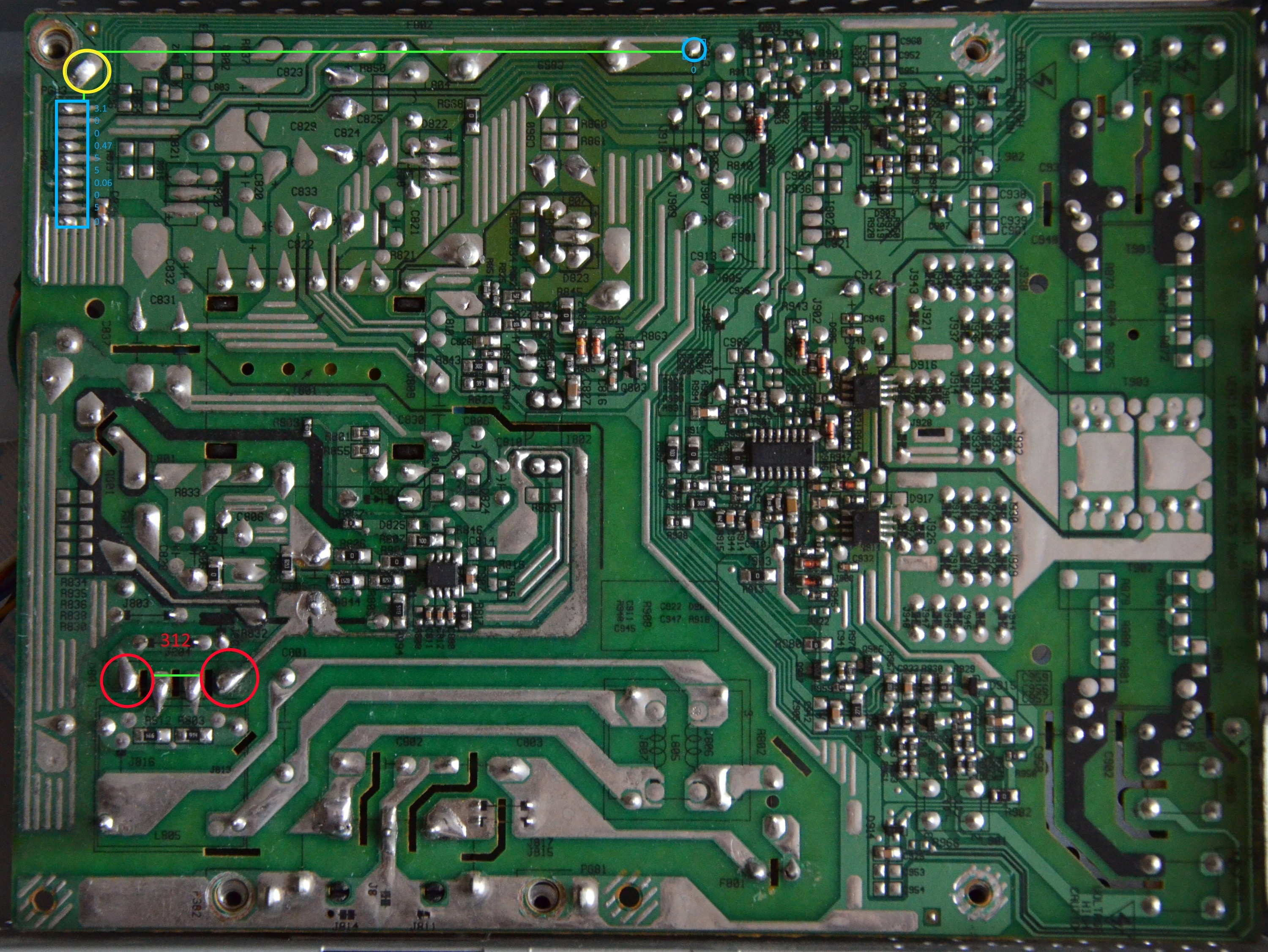 Searching the forum I found this old thread of someone with the same monitor where one of the users suggested to measure the dc voltage between some of the points, so I went ahead and did that and post what I managed to measure in the last picture (the yellow circle is ground).