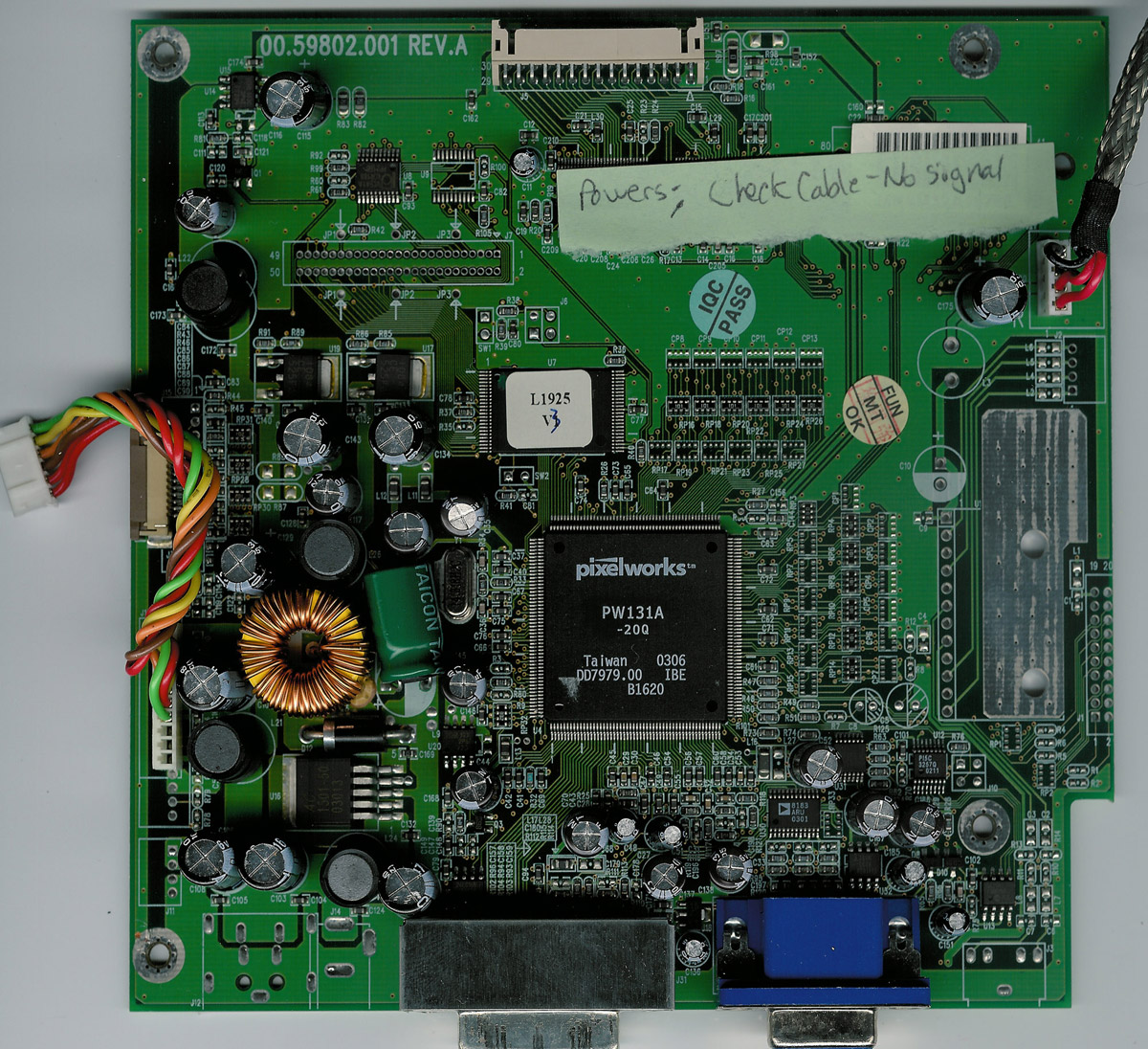 I have an HP L1925 LCD Video Input Logic Board that powers on, and I get the standard "check signal cable" display, but as soon as I plug in a source to either the DVI or Analog 15-Pin VGA, it immediately says "no signal" and places the monitor into standby. I've tried all different resolutions and cable types, but to no avail.