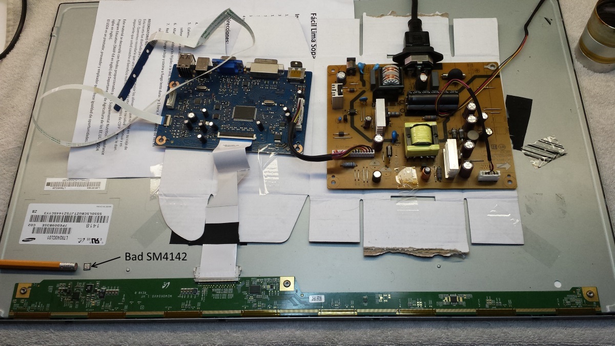 I verified that the power board was working and that the backlight was on. You have to confirm before LED goes to amber. I then made sure that the main board was sending the 5V to the integrated T-CON. The data sheet for the Samsung panel is available online if you need the pin out of the LVDS connector.