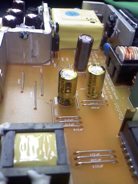 The pictures are with the new caps in place. In the third picture, the red dots show every cap that was replaced. I read that I should maybe try a 100uf 25V cap instead of a 47uf 25V cap where the lone capacitor is. Could that be the problem?