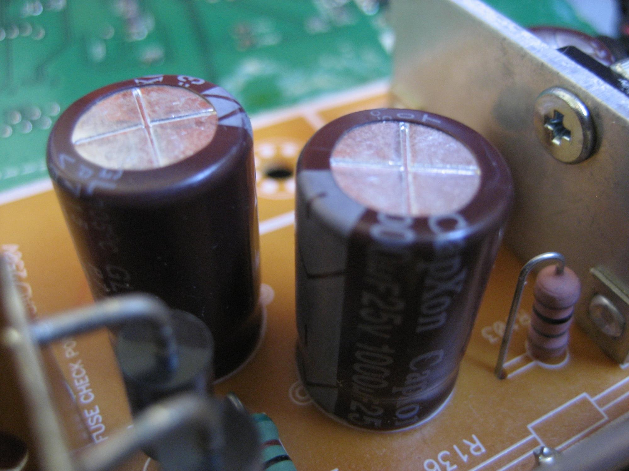 The brand of the capacitors is JAMICON. I'm not sure whether they are general purpose capacitors or low ESR...2) What brand and series did you use for the replacement capacitors? It matters if you used general purpose caps or low ESR (ohms) caps.