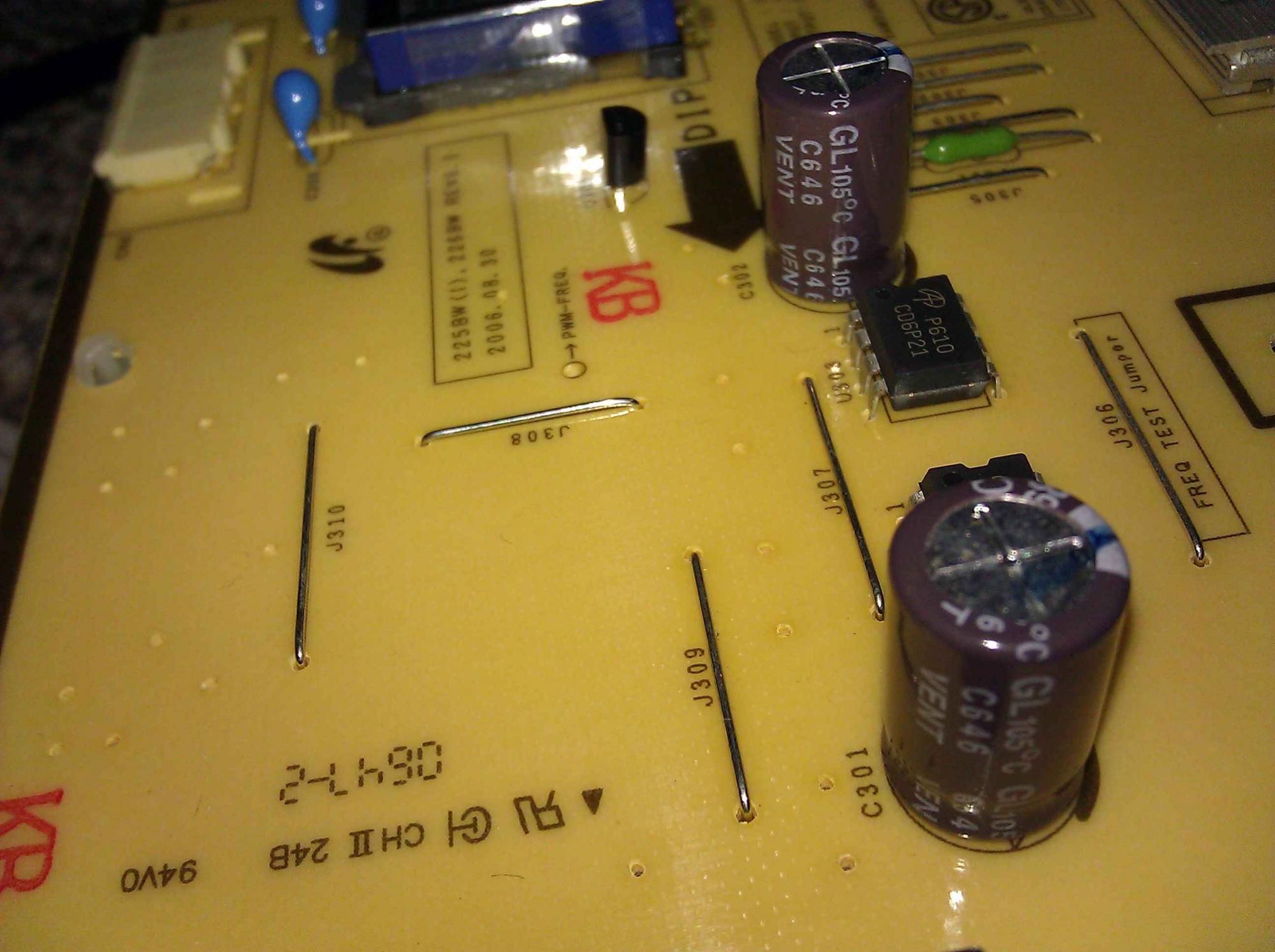 I just want to say this is an awesome thread. For the past two years, my SyncMaster 225bw has been acting up (blinks on and off randomly, takes a few cycles of the power button to return to normal). Just a few days ago, the monitor completely died on me. I turn it on and see the "Analog/Digital" popup, but then the screen goes blank and the blue power button blinks off and on. Can't get it to work no matter how many times I cycle the power button now. Seems to be pretty much the same problem as everybody else on here. So I took my monitor apart and low and behold, I find some bulging capacitors. Went to Digi-Key website and ordered the suggested replacements for each of the caps I found on my inverter board (minus the huge one):