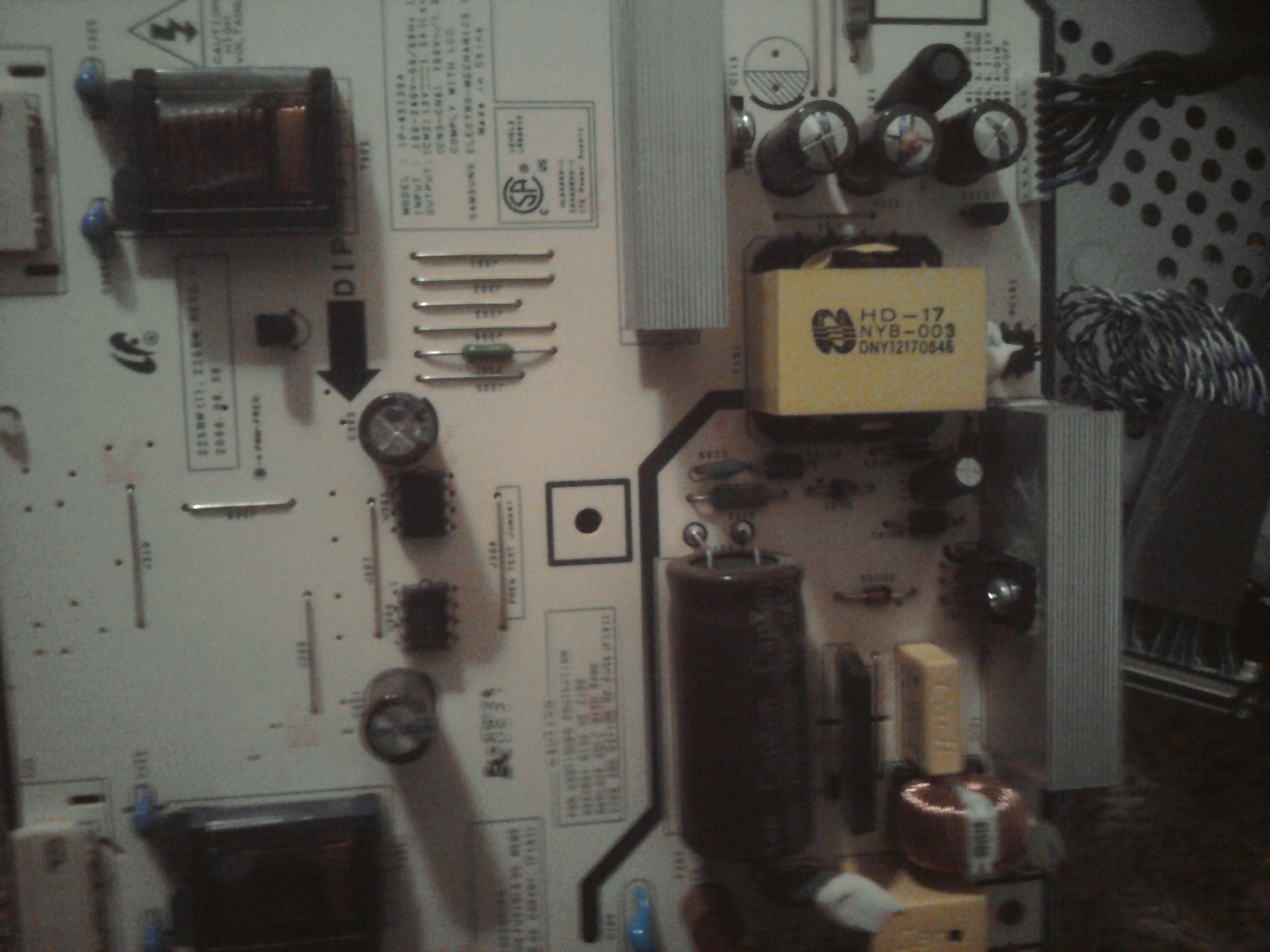 Ok, having a similar problem with my Samsung 225BW. My problem might be slightly different. Started about a month ago. Now when the monitor sits and cools for a perod of time, I turn it on and the picture is kind of faint and washed out and flickers slightly. It slowly gets slightly brighter for about 8 or 9 seconds, and then goes black with a solid blue power light on. Further attempts to cycle the power off and on results in being able to see the "analog" or "digital" up in the corner for about a tenth of a second and then the screen going to black. However, with a front light source, you can see that the display is working, just not the backlighting. At first if I cycled off and on a bunch of times, eventually it would come on nice and bright and be fine as long as the monitor didn't go off. However, someone else turned the monitor off a couple of times, and now it is much tougher to get it to come on perfectly. Eventually after cycling it many times and leaving it off for a random amount of time and turning it back on it will stay on the correct way. I just found this thread and took it apart for the first time today. HEre is a picture of the board. I can see the tops of C110 (820uF25v), C111 (820uF25v), and C112 (330uF25V) are leaking and blown out. The other caps look all right. My question is, does this sound like a problem that could just be related to the bad caps, or is it likely something else that is causing this? My power light does not blink off and on like so many people's did. Thank you for any help you can give me.Comment