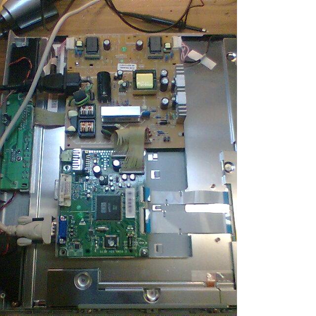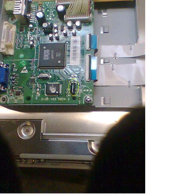 An HP model 1730 landed on the bench, dead. No LED, no response whatsoever. Initial inspection showed no bulged caps, signs of heat, or blown fuses. The power supply was working. Normal voltages were being produced, with the PSU running and disconnected from the video board. When the video board was plugged in, the "5 volt" rail began to fluctuate. At first I thought it might be the video processor IC. Then after testing those pesky little surface miount caps on the video board, I found one that was almost 15 Ohms ESR! (That is the one circled in yellow) Replaced it, and now we have a working monitor!
