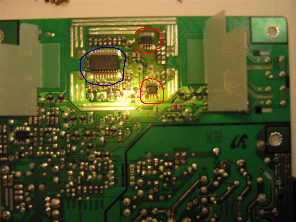 Now, the good news - the results were 'good enough' - kinda. I've marked up the most useful one. The two ICs circled in red are most likely the inverter drivers. IF I am right, they will have identical part numbers. What are they? The IC circled in blue is the inverter controller. The part number of that would help understand how the circuit works.