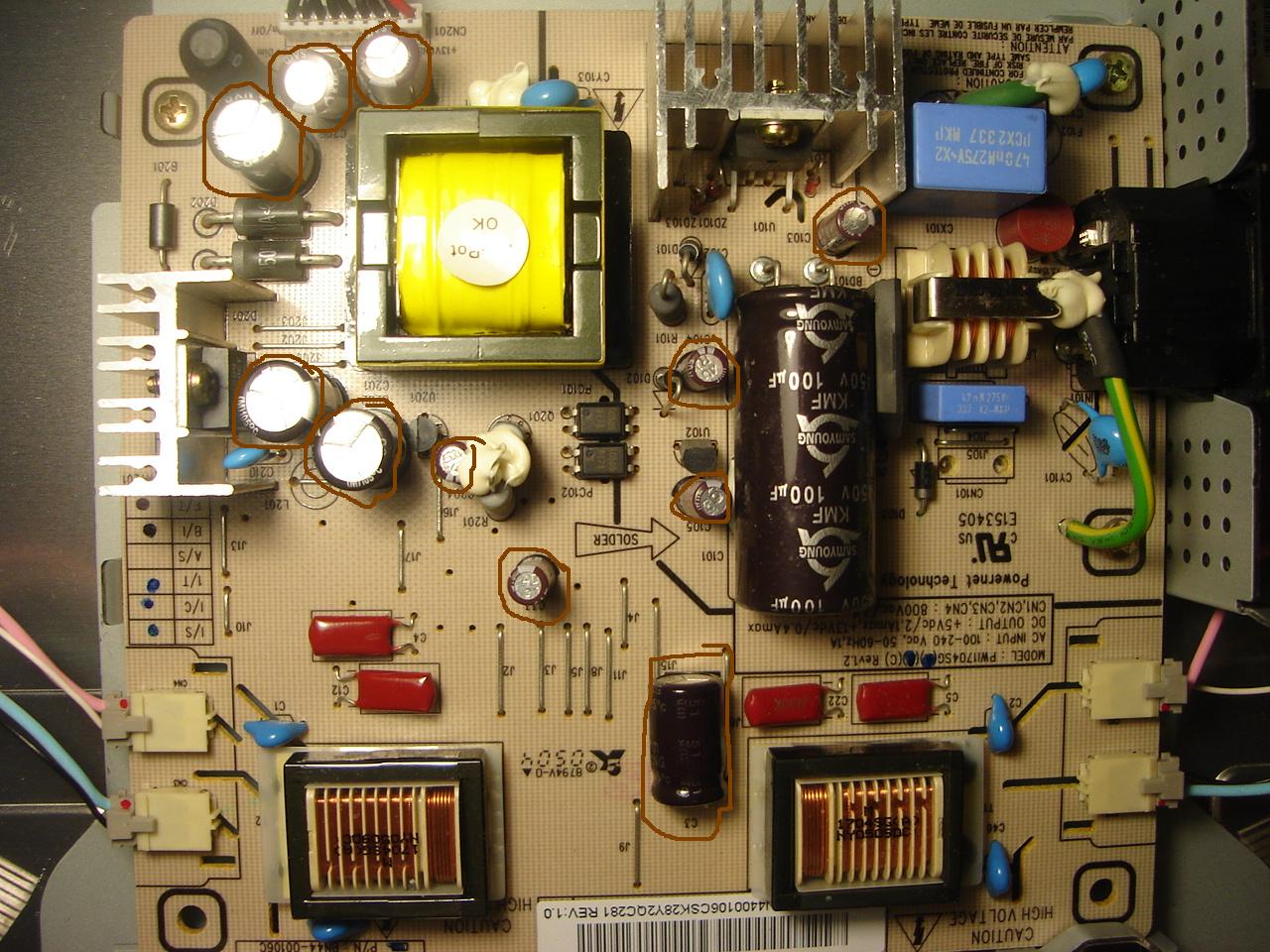 Recently, I got the captioned monitor and the owner said it could not be turned on. I open it up and found that one of the SMT capacitors seemed to be bad. I replaced it as well as the other one. The monitor still could not be turned on.