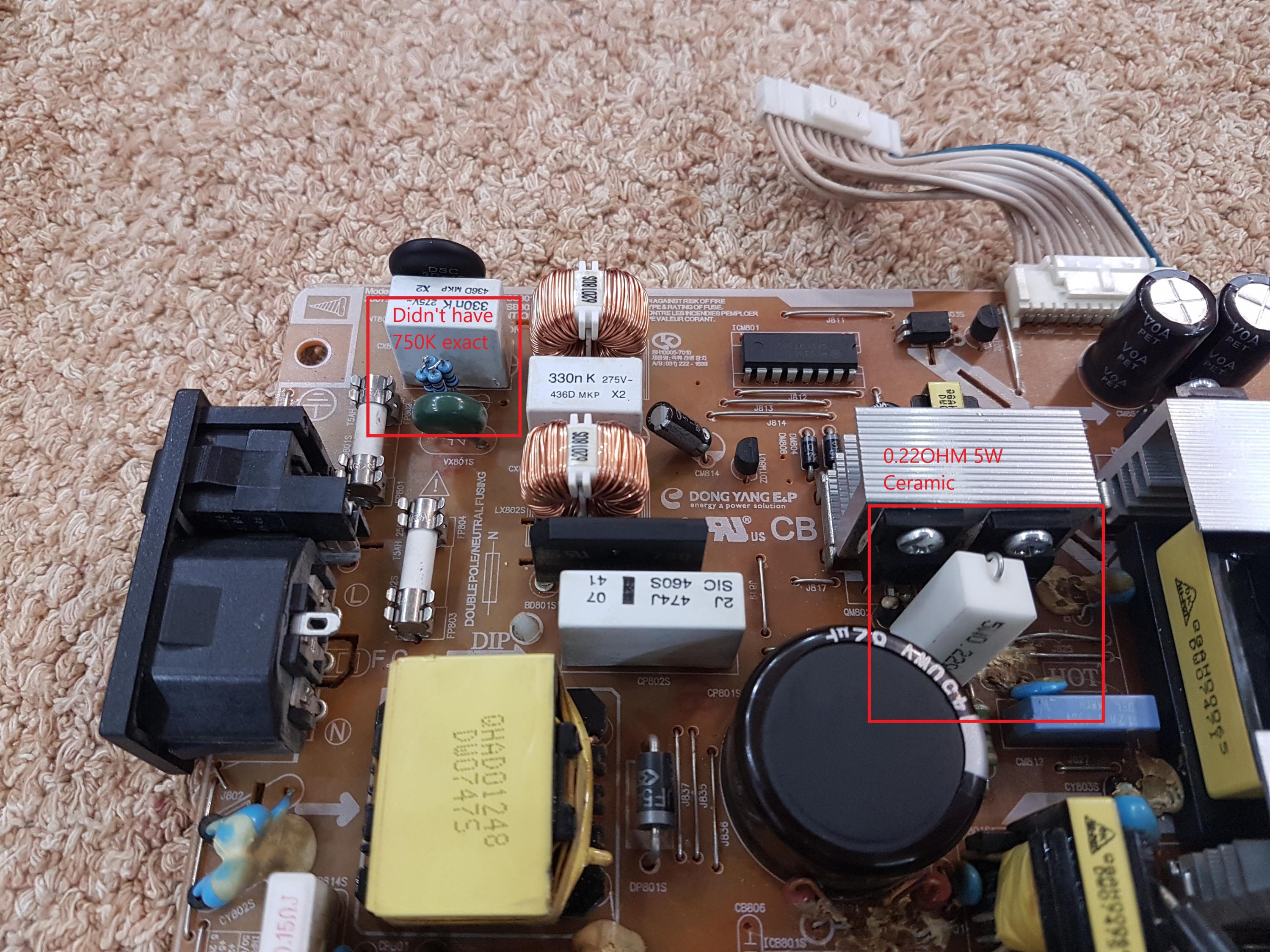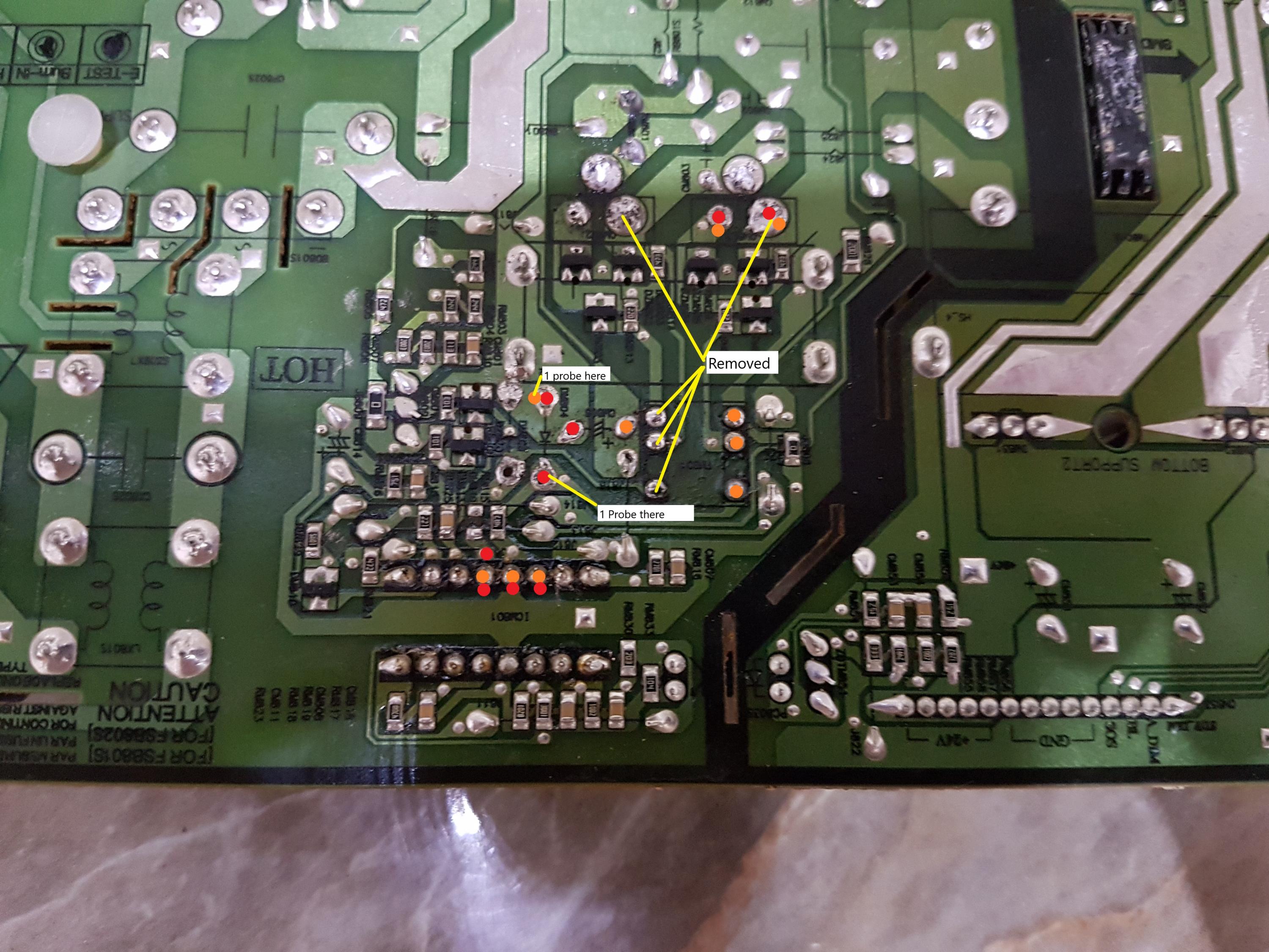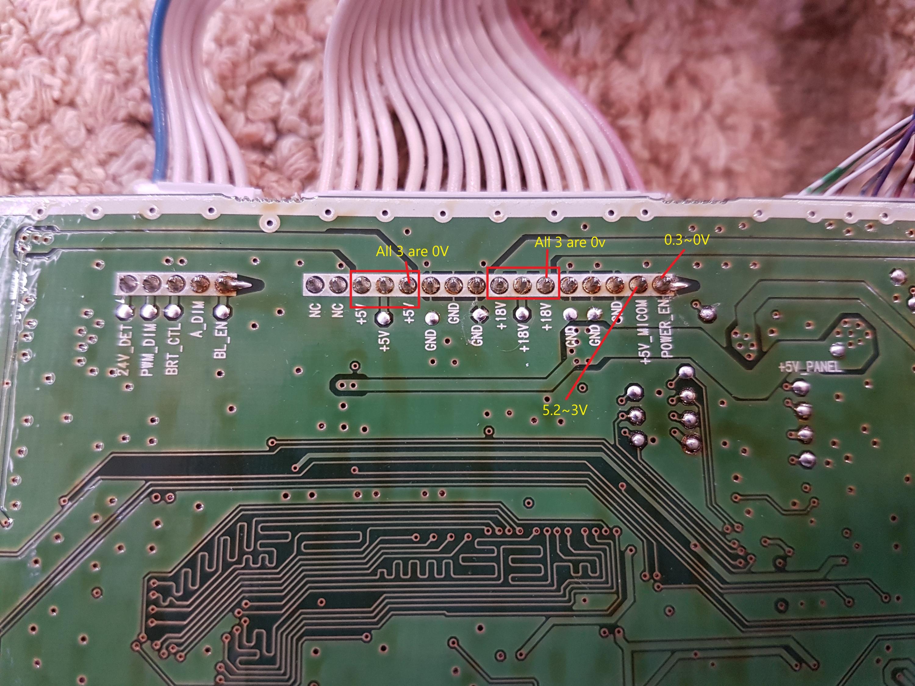 I replaced 2 resistors RM801 0.22 and RX801S 750K using schematics i downloaded, removed almost all of the brown glue on high voltage parts, checked voltage on Power_EN which was 0~0.3, and S_B which is 5.2~5.3V, 0V on 24V, and 0V on 18V lines. (See attachments below)