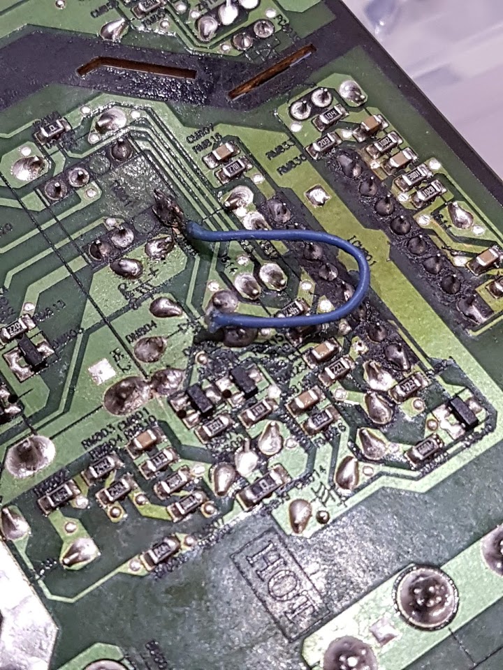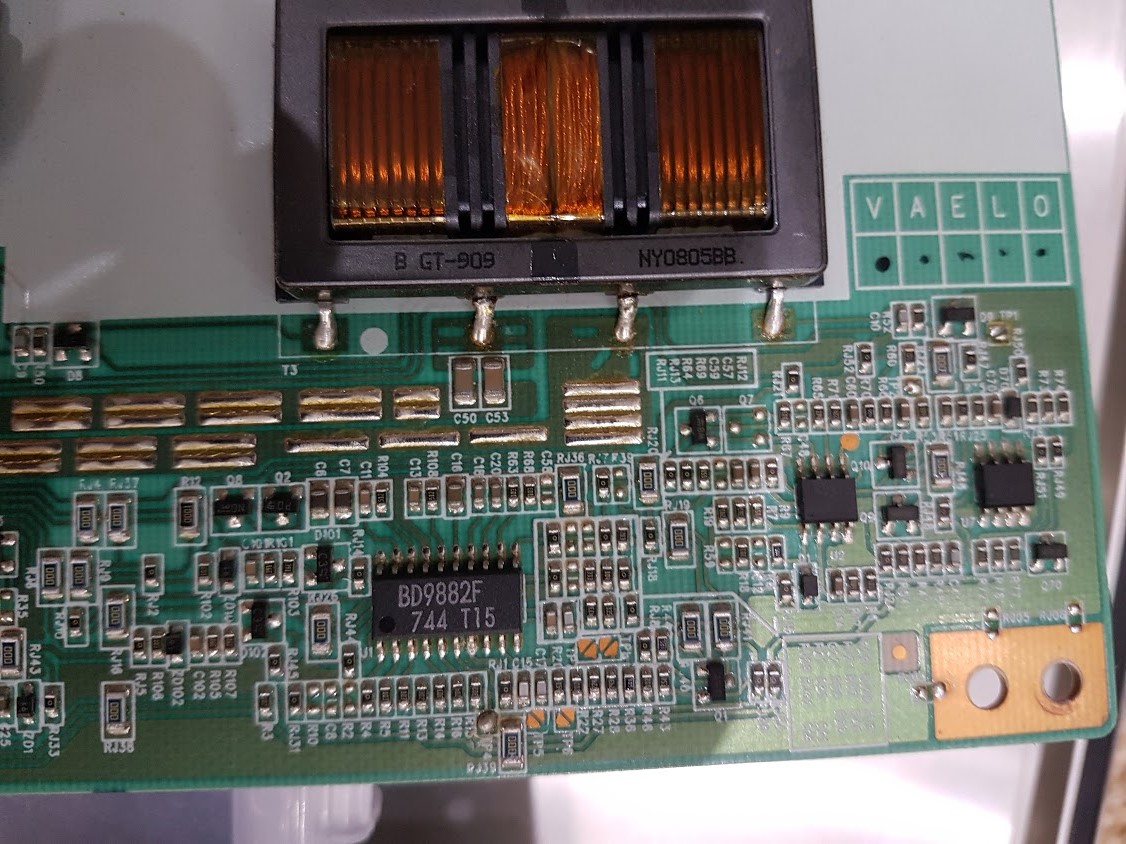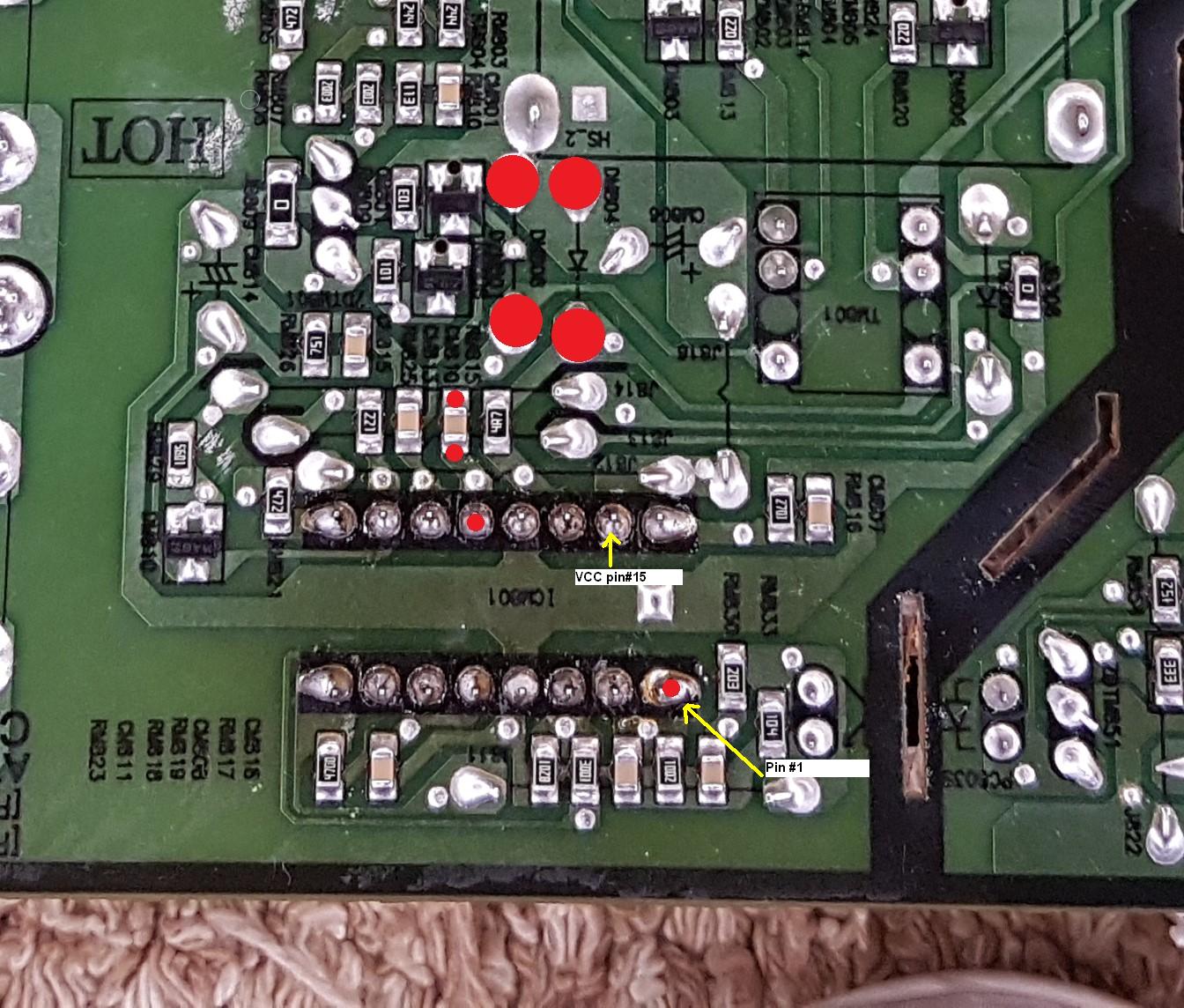 I replaced 2 resistors RM801 0.22 and RX801S 750K using schematics i downloaded, removed almost all of the brown glue on high voltage parts, checked voltage on Power_EN which was 0~0.3, and S_B which is 5.2~5.3V, 0V on 24V, and 0V on 18V lines. (See attachments below)