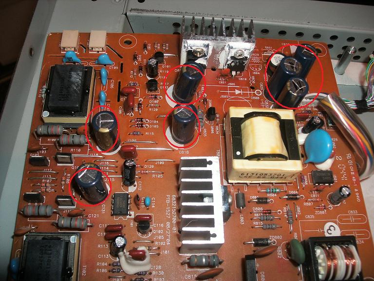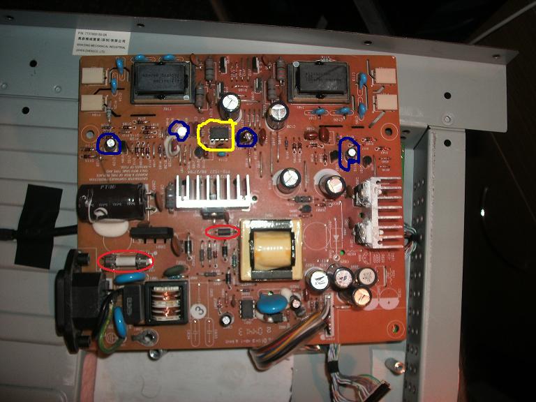 Okay So I guess i will go ahead and say, usual symptoms.. switches on for a second then the backlights go off. So I opened it up to find Crapxon caps all over the place, I replaced the majority of these (all of them excluding a few tiny ones) I re-soldered the transformers and tested (well i say tested.. i tried to test :P im still new at this) the transistors, from what i understood they were okay anyways.. so I put it back together and still the same... although it now lasts for around 3 secs instead of an instant switch off. I unplugged the two monitor connectors in yellow and the screen stayed on for an extra few seconds, i tried variations of this and it seemed to me the problem is on that side of the PCB. Screenshots below of what I mean by the way hehe. Also below is a pic of all the caps i replaced (in red) and the fuses i tested (in red). and the area i think may be the culprit hehe. Anyways I wanted to know what you guys think i should do next now I have assessed that the probem is located somewhere on that side of the PCB, maybe the transistors really are gone? (even though i got the same readings back from them that the two on the other side gave me) or maybe i didnt re-solder the transformer well enough? I will give re-soldering properly another go in the morning but until then I thought i would use this time productively and let you guys take a look, Thanks ^^