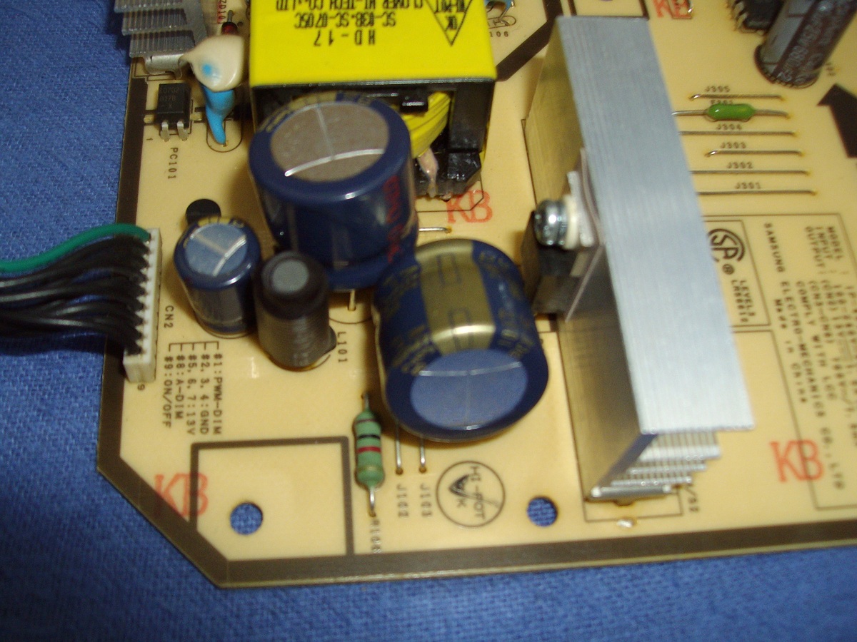 Another Samsung 226bw with bad cap problems. It has been ongoing for a few months but I've not had the time until now to try and fix it. Yesterday it took 3 hours for the monitor to finally warm up so that was the last straw. Opened it up, figured out which caps I had and what to replace them with from the info contained in this helpful thread.