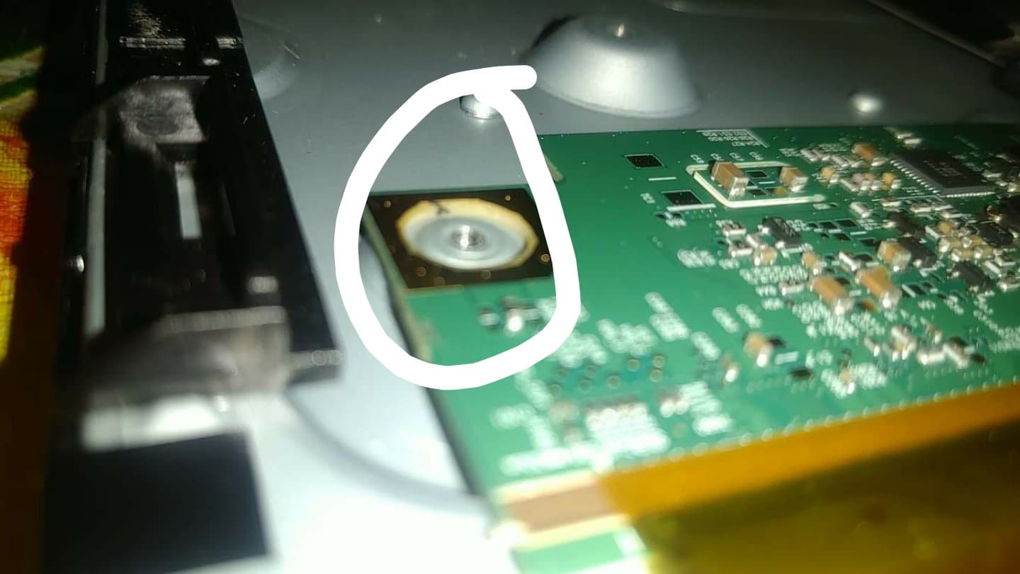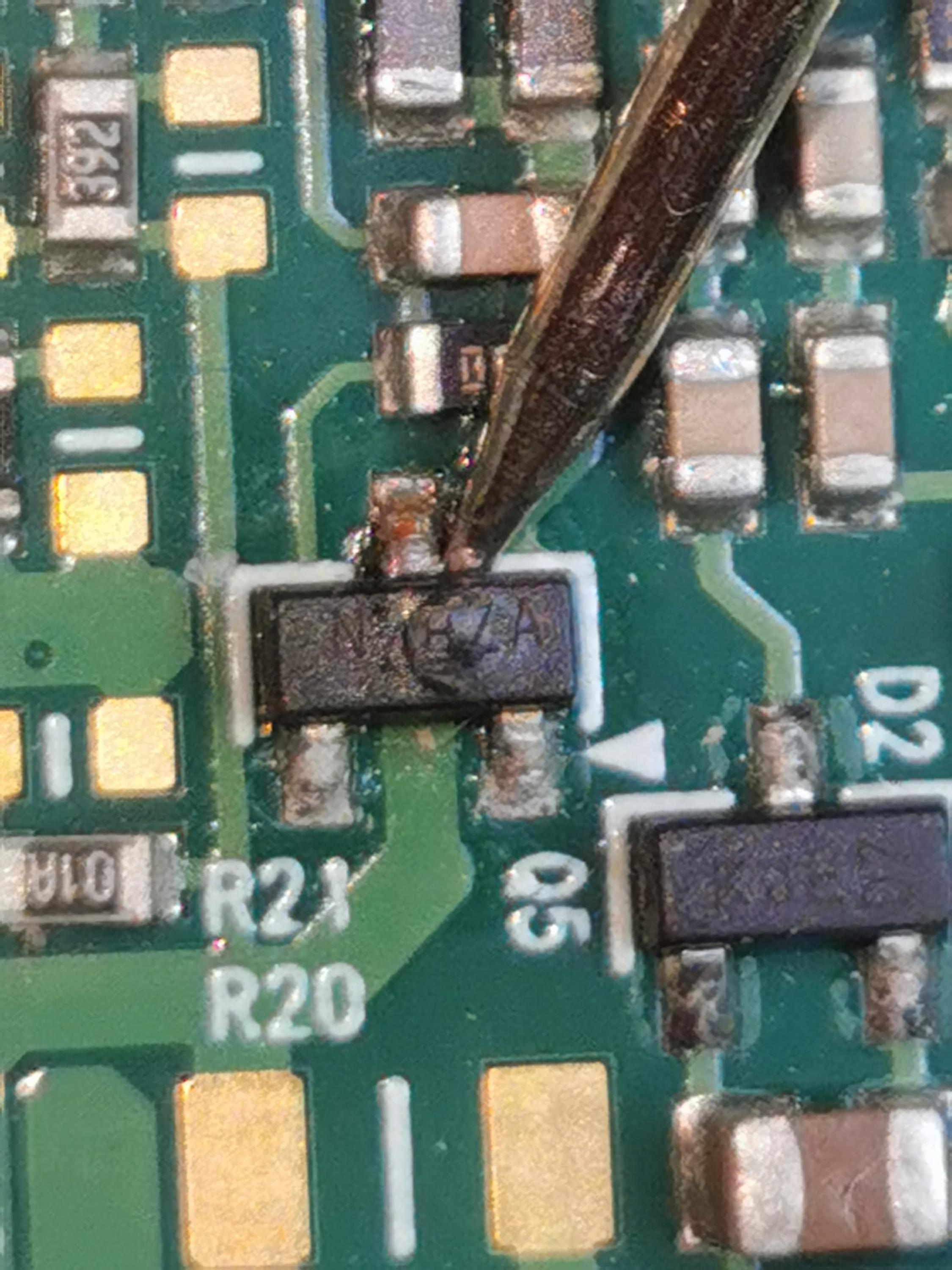 So I bought my monitor used (I know it wasn't a good idea), and the day I bought it after some movement the screen went black(only backlight) and I heard a high-pitched noise, but I found out if I grip the bottom-right corner tight it fixes itself (I know this isn't a good sign). I used it for around a half year it showed this problem maybe three or four times always fixed it with the said method. Around a month ago it showed vertical lines repeated and slightly washed-out colors. I tried to fix it with the grip method, but the picture went out and haven't shown anything since then. When I disassembled I tried to re-seat the cables also to have only one cable plugged into the T-CON at a time but no dice. Also interesting fact that the whining only occurs when the t-con's shielding is on which led me to check if there is any mechanical damage, and where I used to grip the monitor the screw-hole looked like the first attachment. Also, I found a (probably) blown-up transistor but I can't identify it based on the markings. Also, I think, I've measured all capacitors on the t-con and I haven't found any shorts.