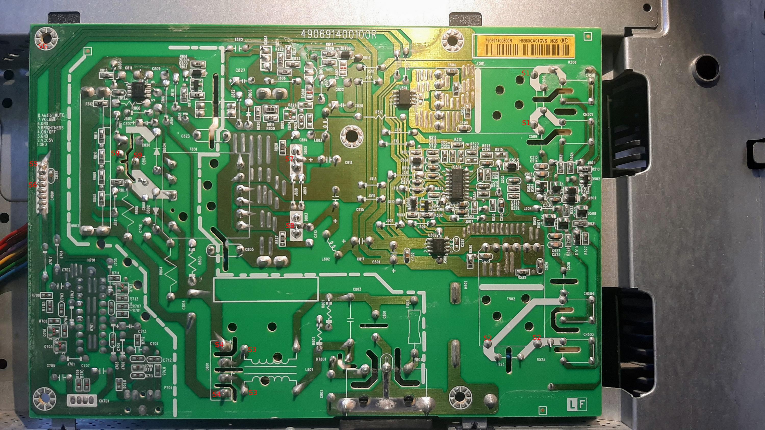 I did some more tests with the power connected. Note, the ribbon from the decoder board to the LCD was disconnected, and so were the CCFL lights. I confirmed there is AC power at 120.3 V across the rectifier supply (S3-S3). I confirmed that I have 160.5 VDC at the output of the rectifier (S4-S4).