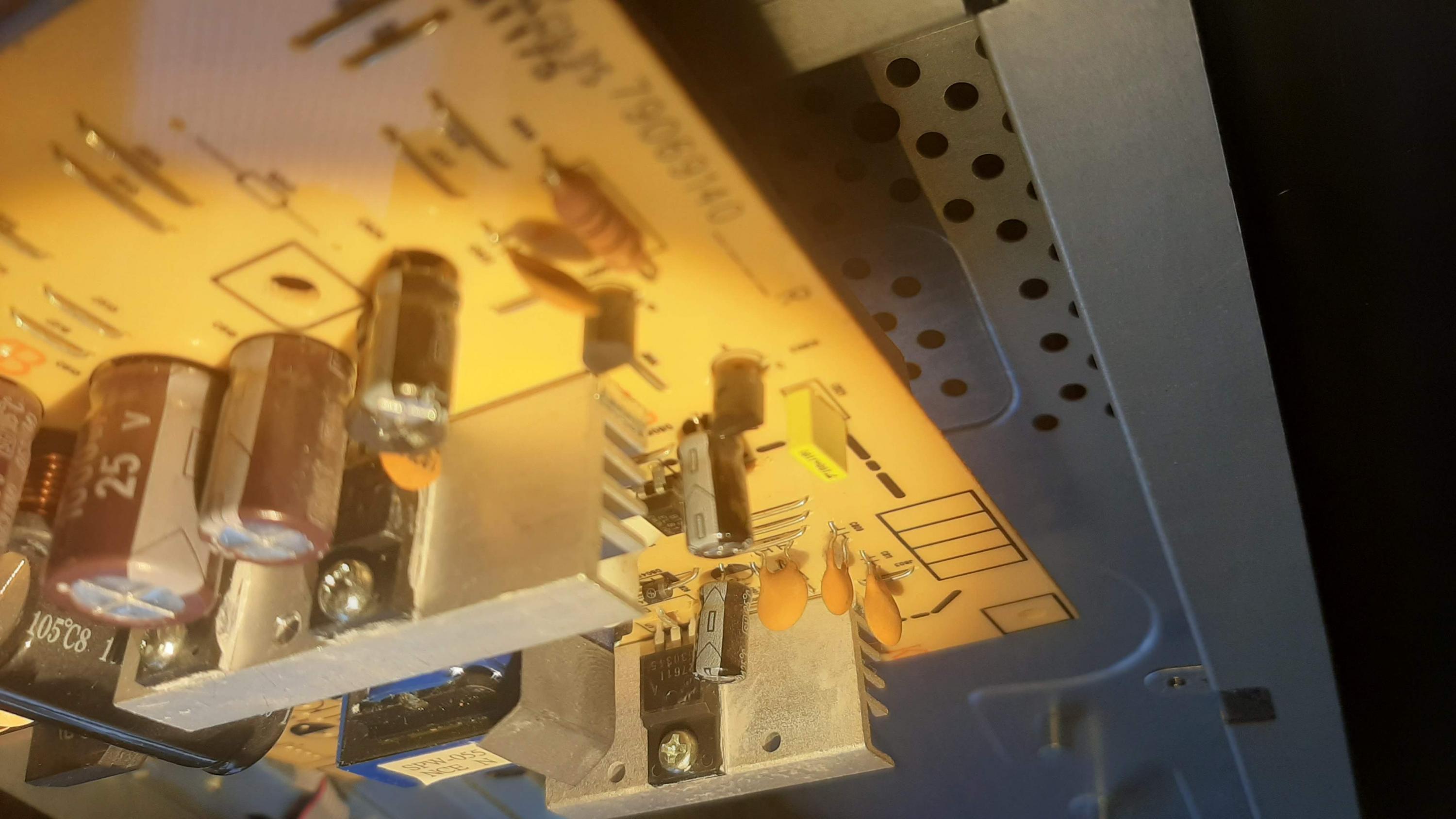 I have heard there is a common issue where capacitors could malfunction and cause this issue. I see no signs of damage to any capacitors on the power supply board. (No bulging, no leaked electrolyte. Maybe some have pushed away from the board, esp. the 25V 47uF ones: C807, C820, C827)