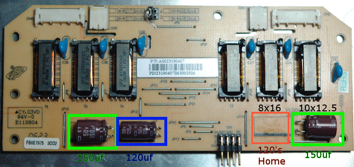 Ok here goes, on the inverter board are 3 CapXon GF 35v 180uf 8x16.5 caps, the CapXon datasheet for GF series does not show ripple max or anything for the 35v 180uf caps as if they never existed.