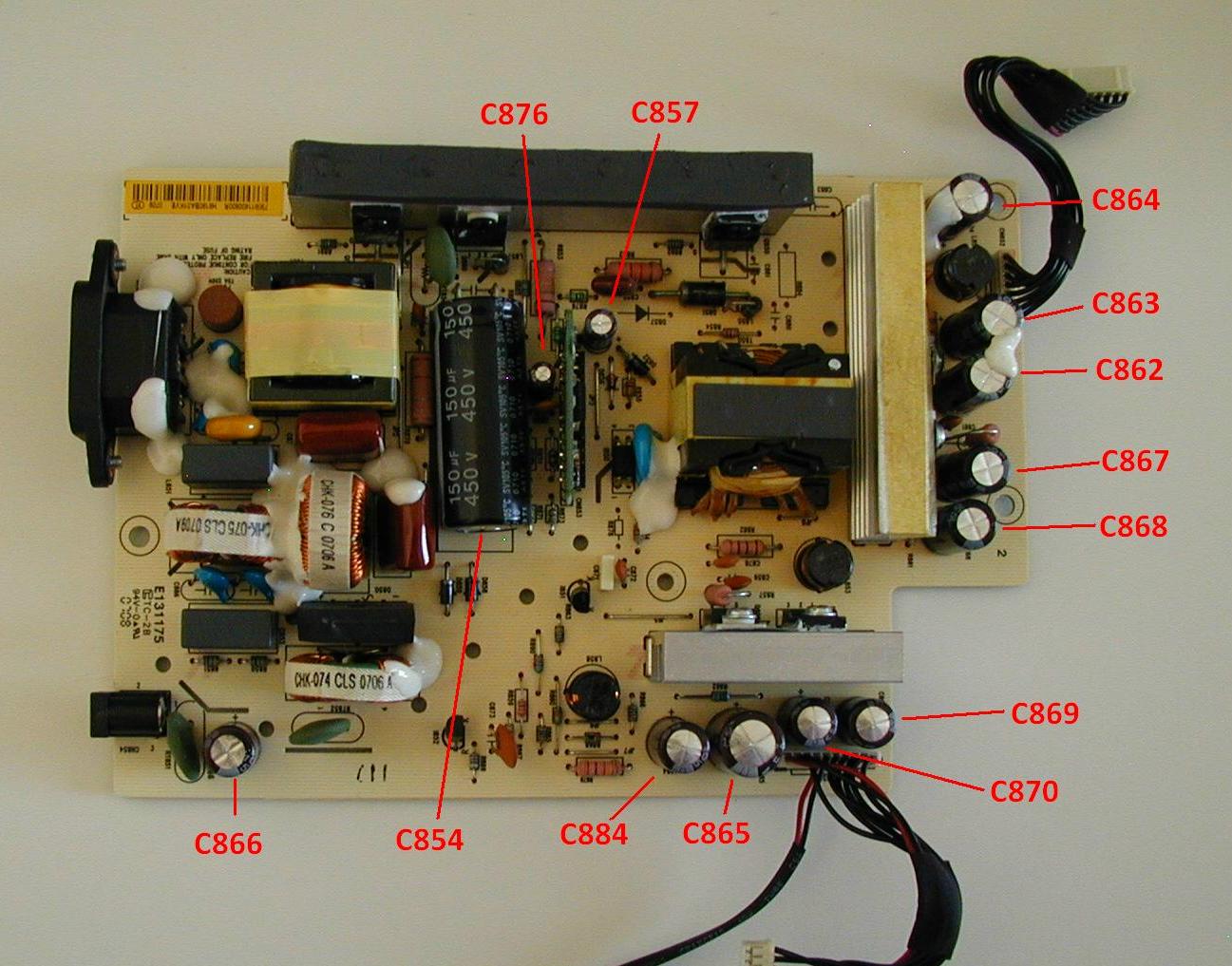 After searching the net for monitor repairs I found a couple that said to check the power supply. After pulling the power supply I found several bulged caps. Though there can be more going on, the caps appear to be an fast and easy fix to start with. On top of that there are 5 bad caps that need replacing no matter what the problem may be in the end. All the caps are Su'scon. Since I have to replace 5 already, I decided to replace all 13 caps on the PCB with better known good caps.