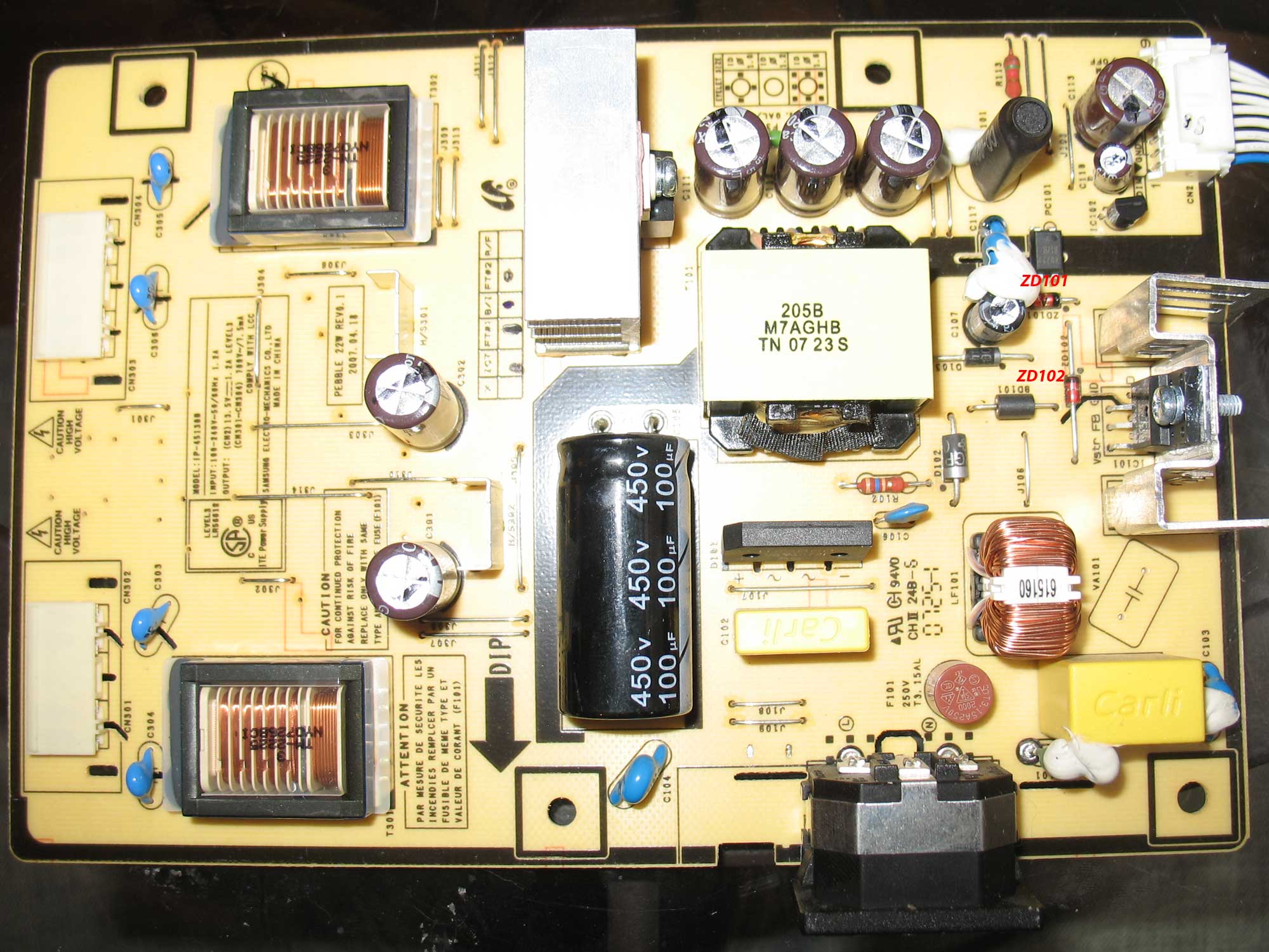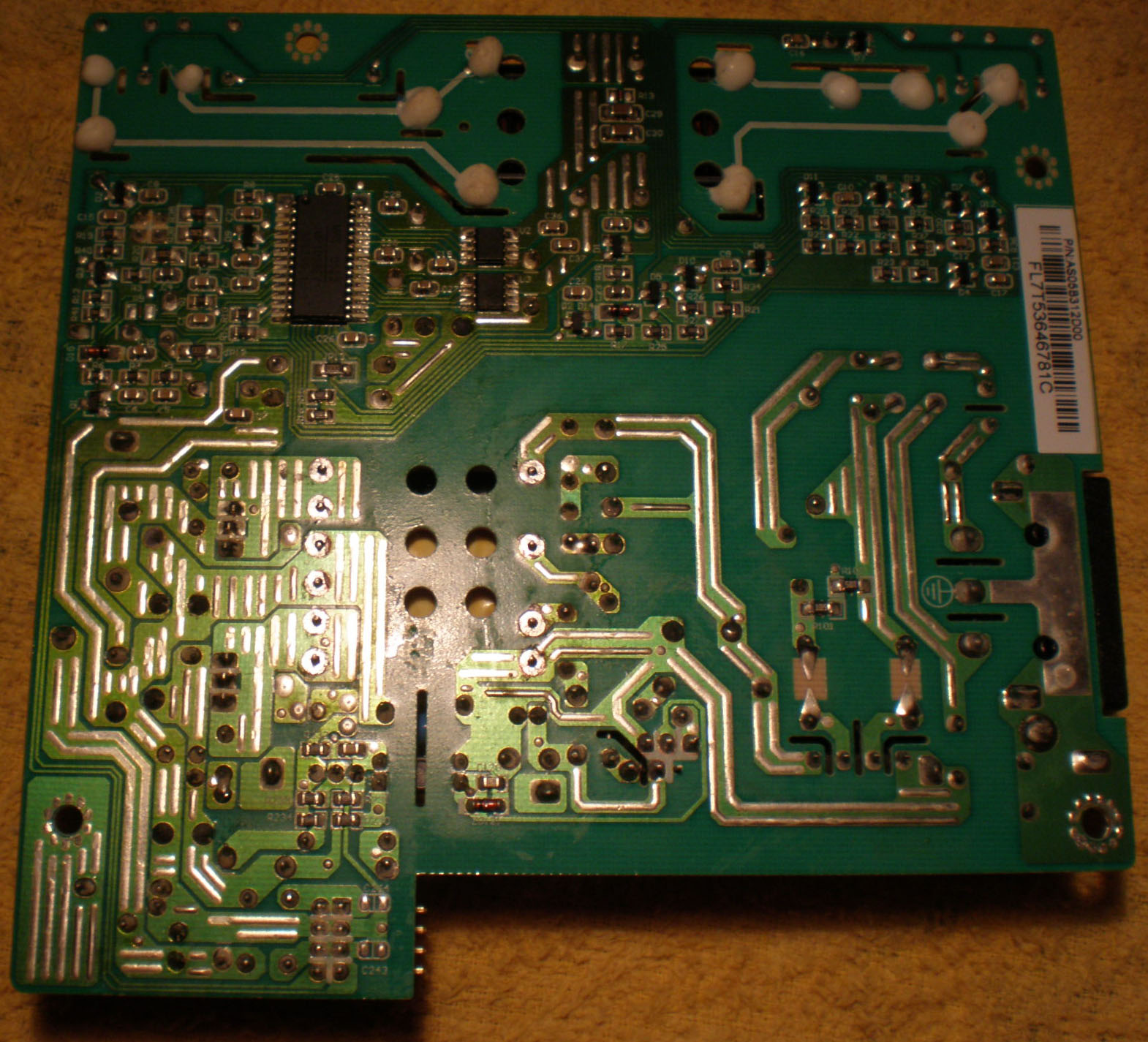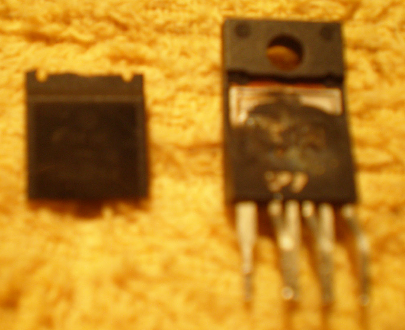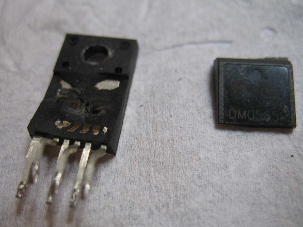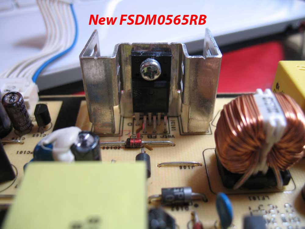 Basically the problem began with a bang that almost knocked me out of my seat. The LCD immediately switched off and couldn't be turned on anymore. I inspected the power board and noticed some bulged caps (CapXon) as well as the mos-fet chip (FSDM0565r) which had been blown apart (see pics which are all post-cap replacement). It took me a few days to find the rest of the chip as shown in the picture