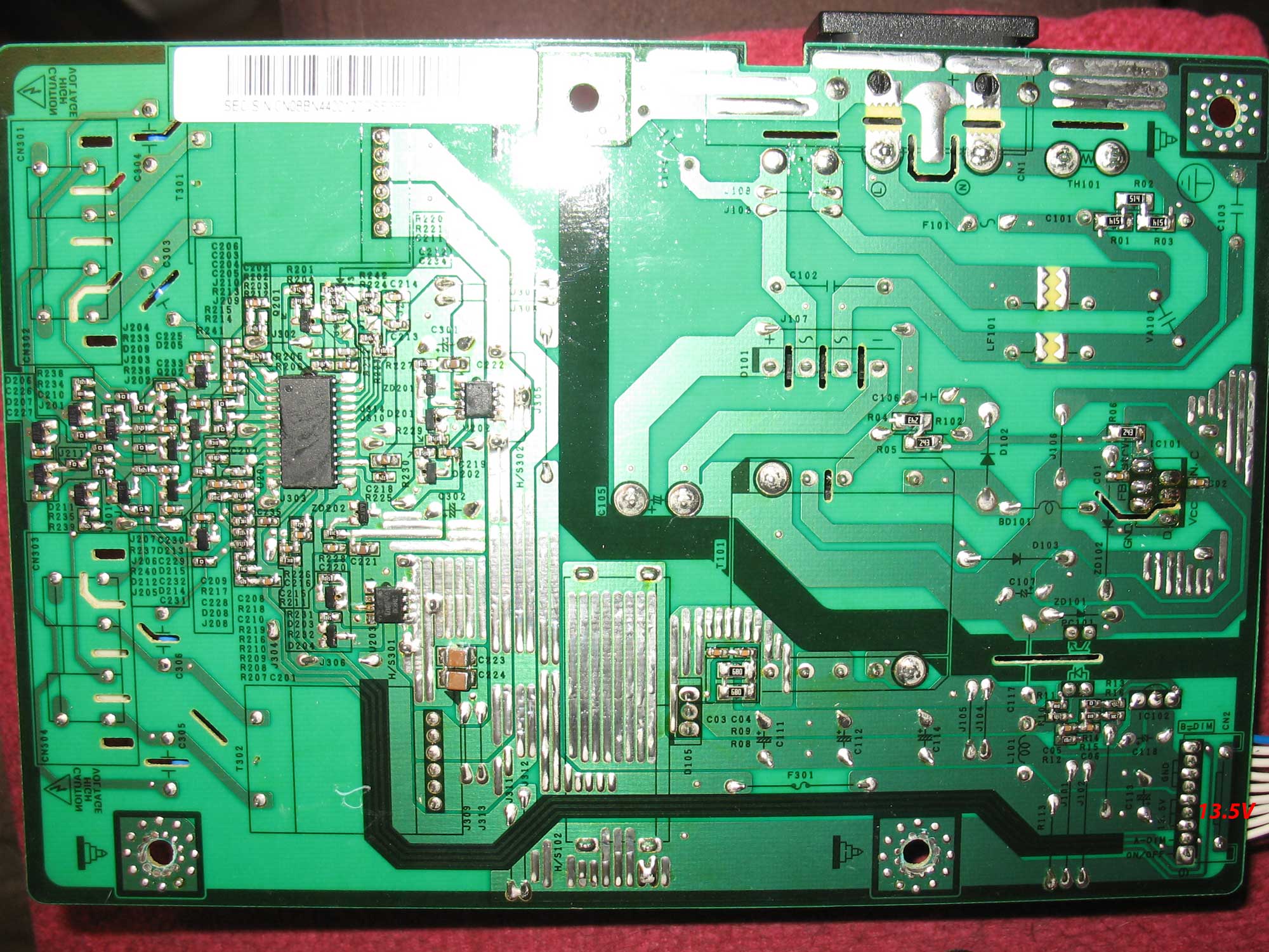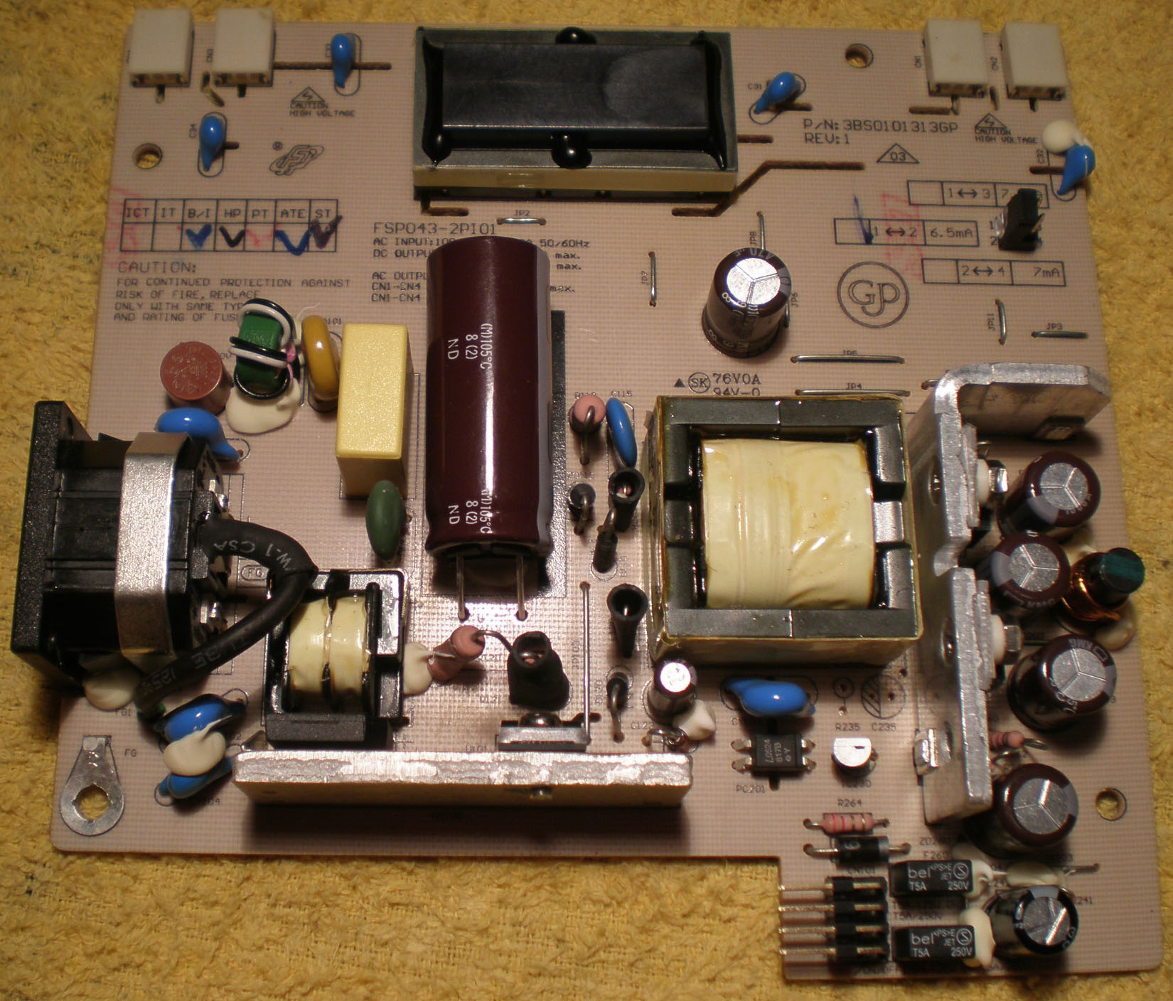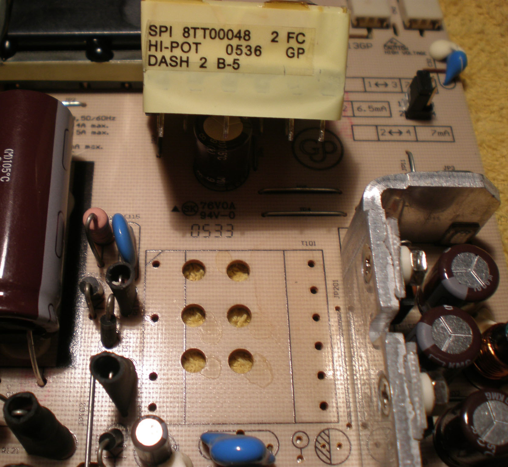However the monitor is still completely dead. I then checked voltages across the power board and noticed that the input side is apparently working well. There is 330V through the 400V capacitor. But there is no power at all on the output side after the transformer.