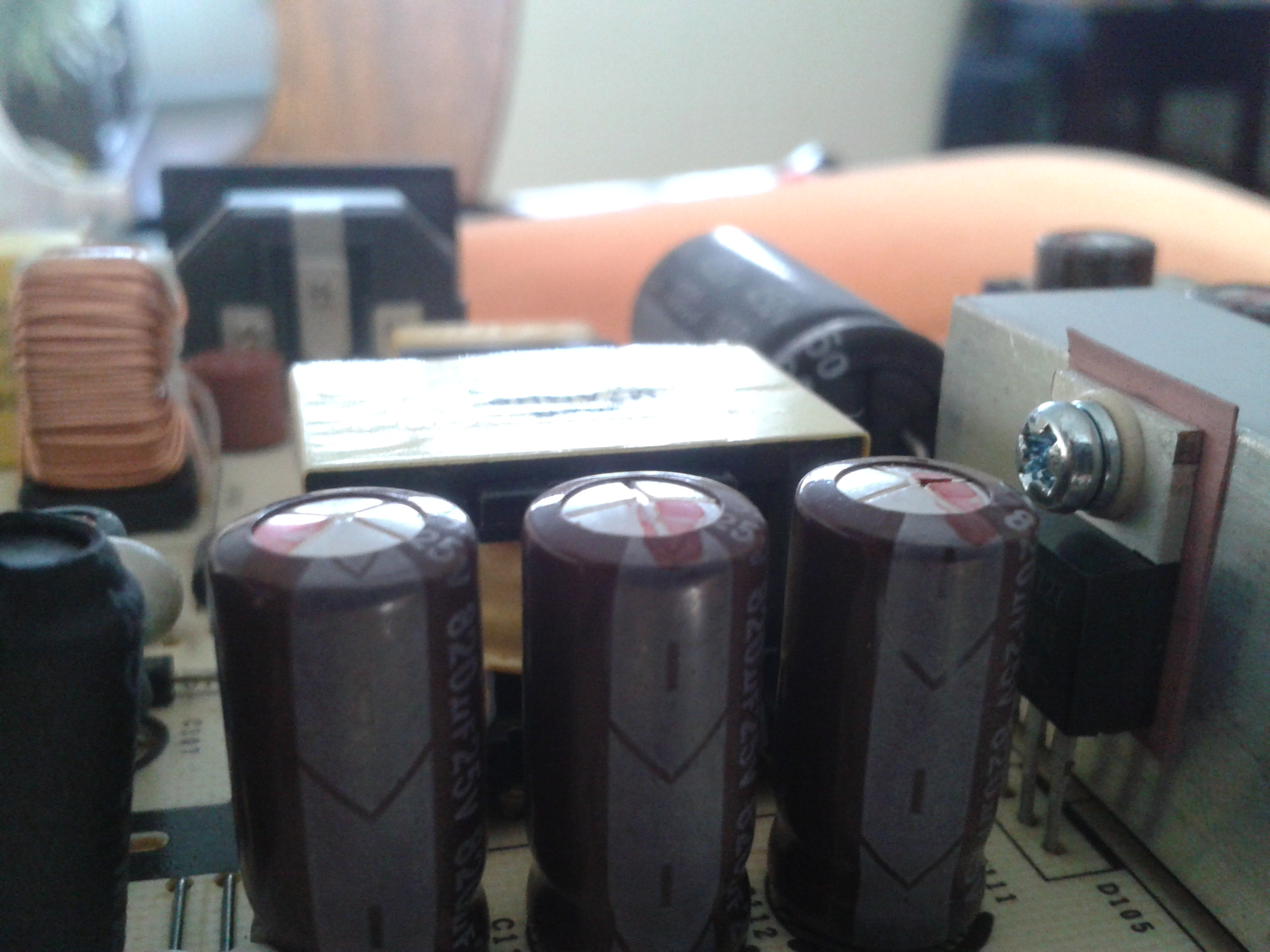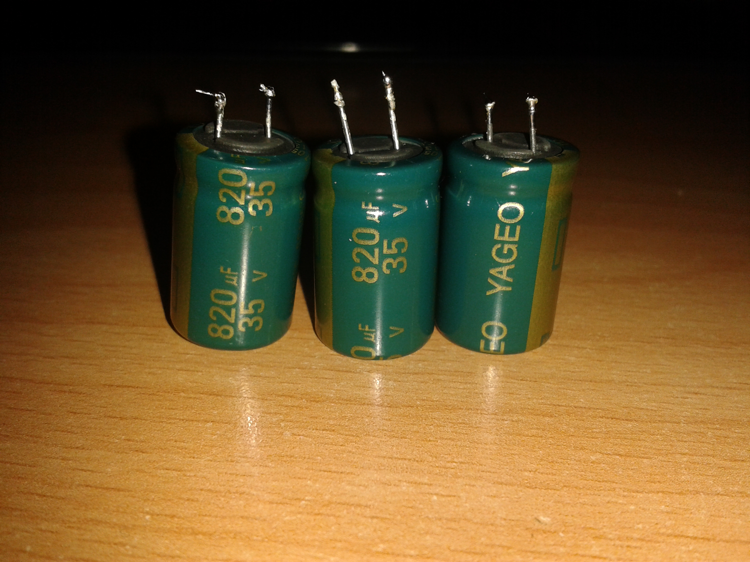 All 820uF 25V, and I only had 820uF 6.3V ones - on the power section, they're 3 connected in parallel making combined 2460uF.