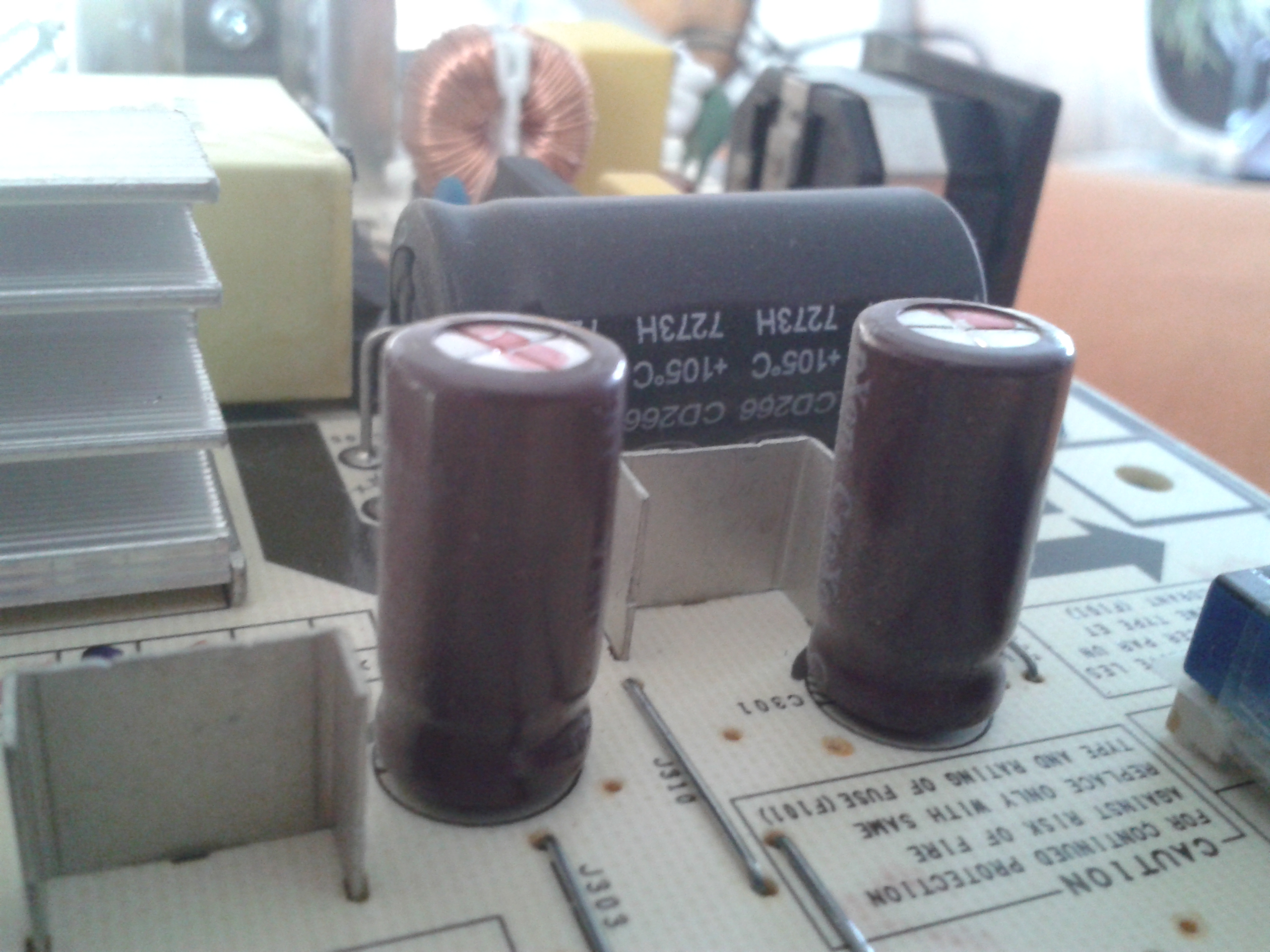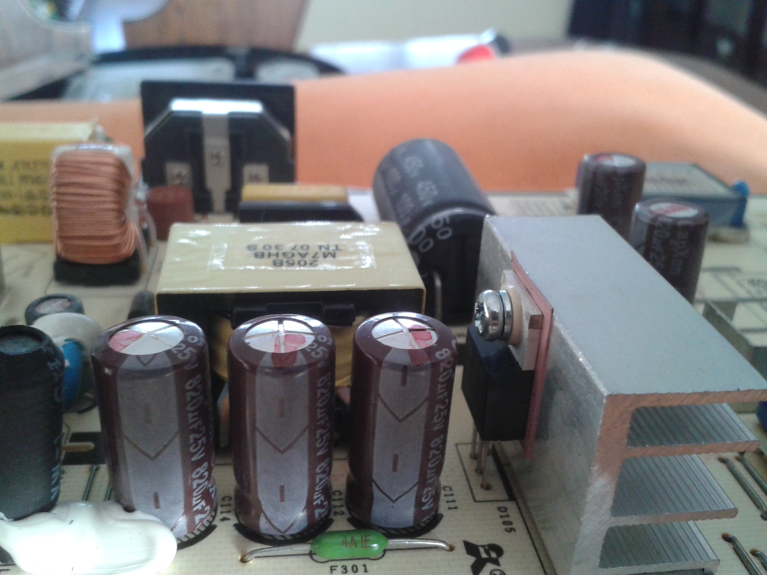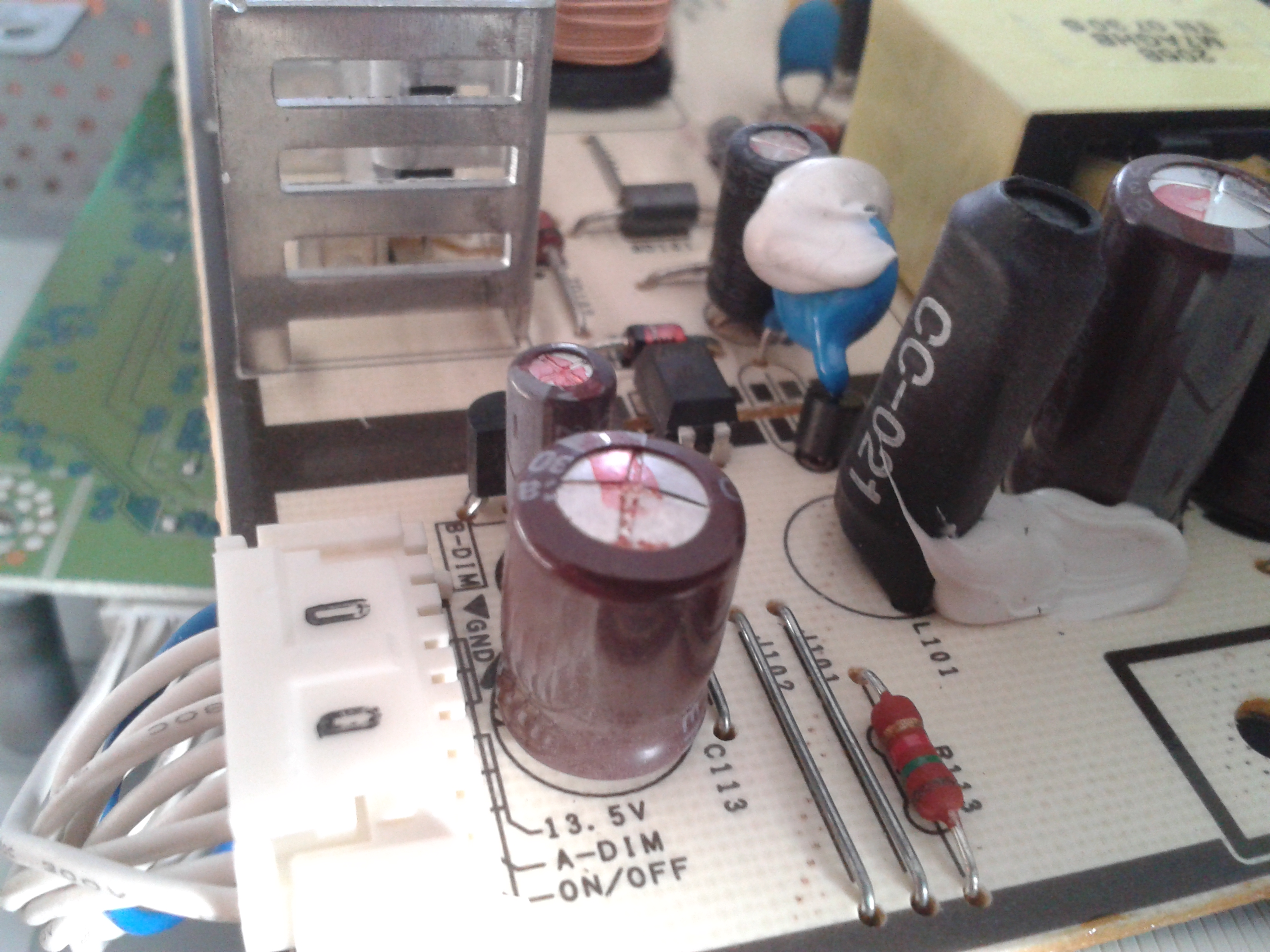 No back-light, no image, just PWR LED gradually get off and then with flickering turns back on, repeat. High frequency noise coming from back. Must be caps, I thought so I took it apart.