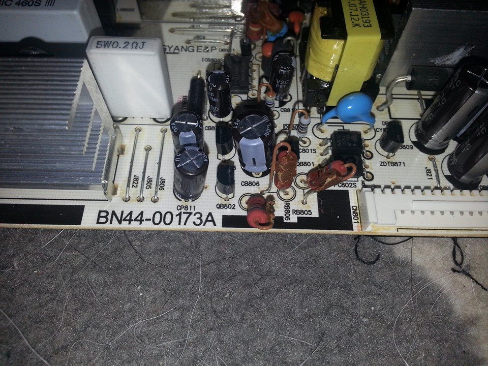 Got a monitor from my friend. Power supply is BN44-00195A. It gets 2 fuse blown, NT801S blown as well. After some work, cleared up all bad glue, found QP801S blown as well, replaced QP801S. I do not know what NT801S is, just found one NTC thermistors from a old computer power supply. Now connect all the boards together, I can see the blue power LED blinking, but I can't turn it on. Measure the main board connect, only SB give the 5.2V. Checked PFC, it is 155V only.