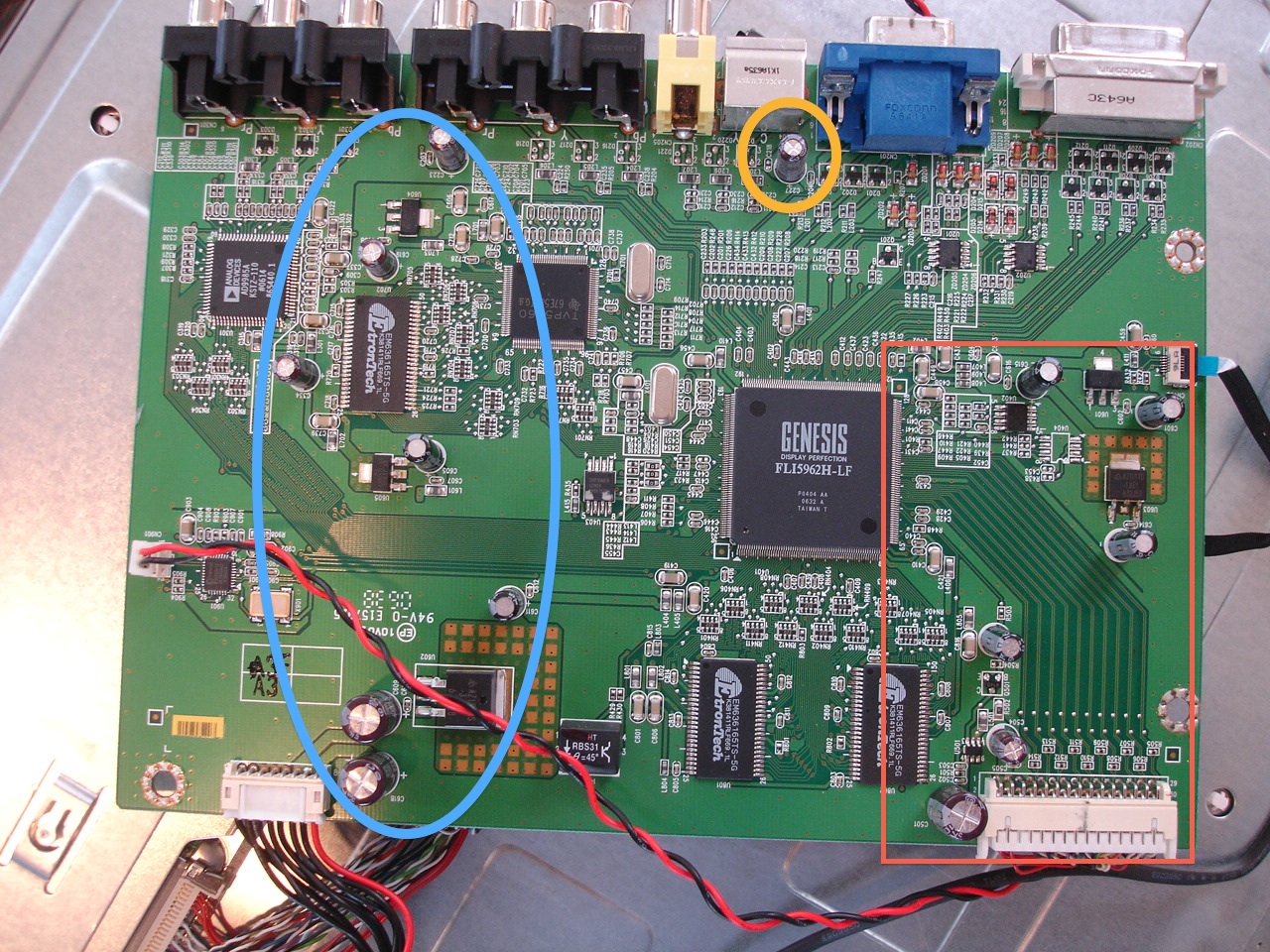2) I'm going to try to attach pictures to this post (remember, I'm new here so I'm not sure I'll be successful). I don't see anything that makes me think any of the capacitors are bad (I've read about the symptoms - leaking, bulging, etc.). Does anyone see something I don't? I've put some numbers next to capacitors in the pictures and drawn some circles and squares to try to give people a way to tell me what to look at. If you think my labels are messed up, please let me know - they're guesses on my part.