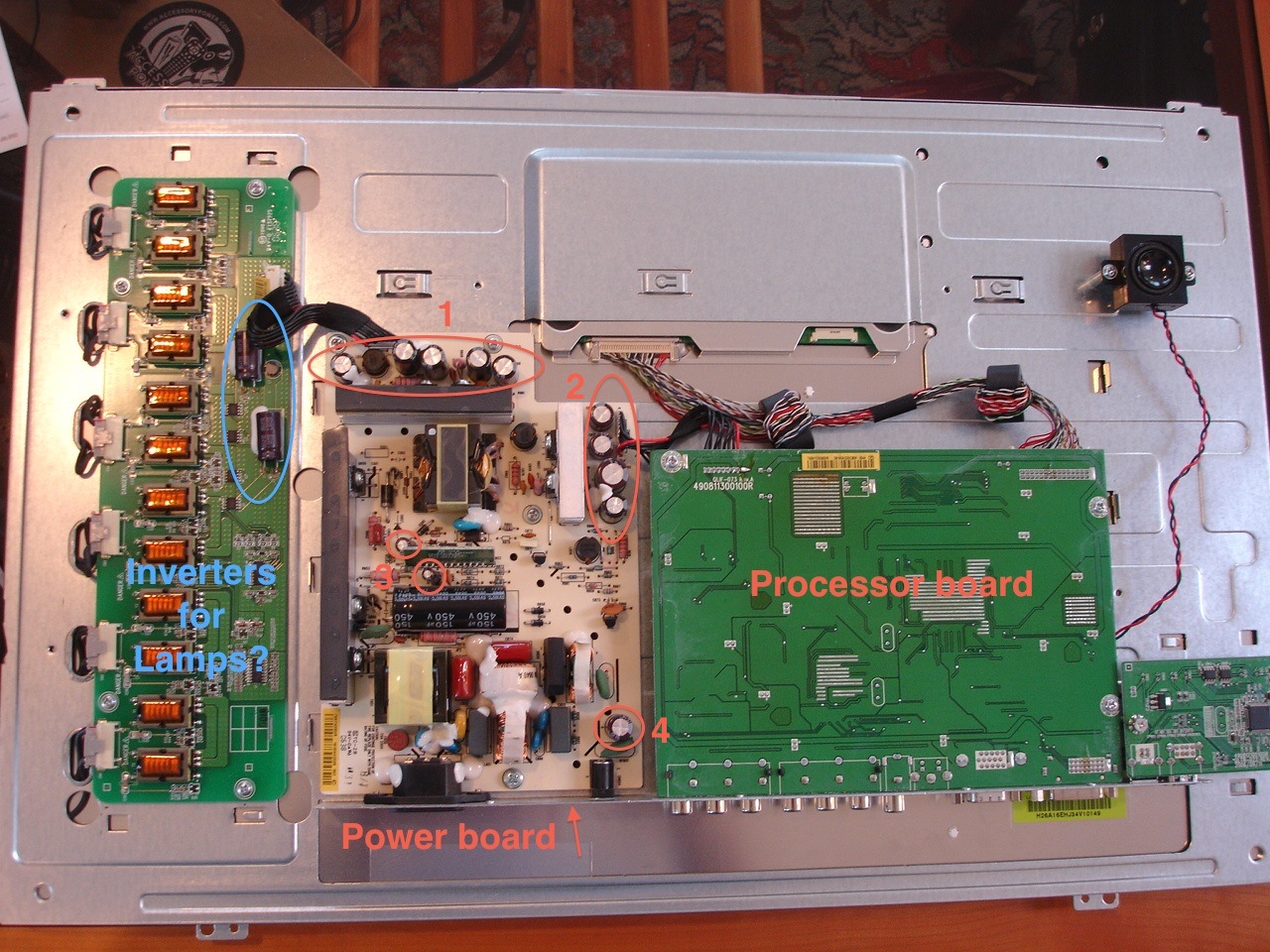 3) If it does seem like a capacitor problem, do you think my guess about the processor board is correct? Should I start with those capacitors? Or is it possible the problem could be on the power board?