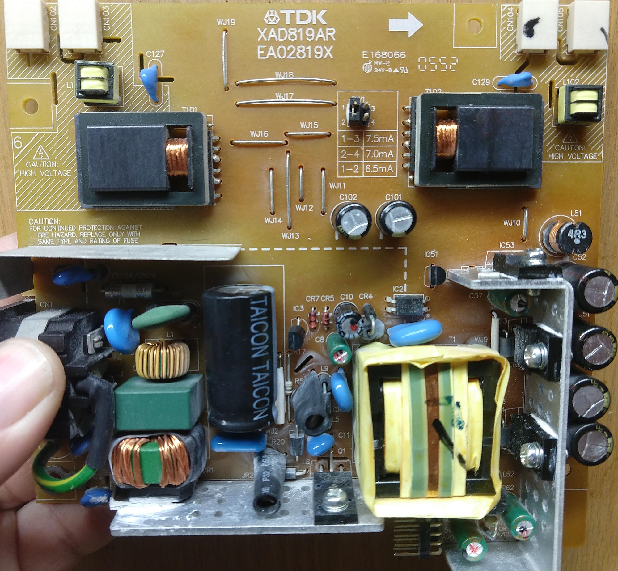 I pulled it apart to discover that I had partly recapped it at some point years ago. I have no idea why I only did 6 of them and not the other other 6. I don't see any obvious bad caps but obviously I don't trust the other 5 and the big 100uf 400v one either. With PS board unplugged from everything I powered it up and I could hear the ticking sound coming from the transformer about once a sec. I checked the outputs and was getting 4.98v on the +5 volt but only about 6.3v on the +12 and that was bouncing around.
