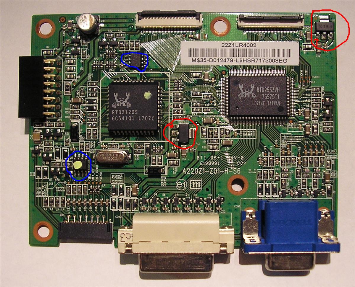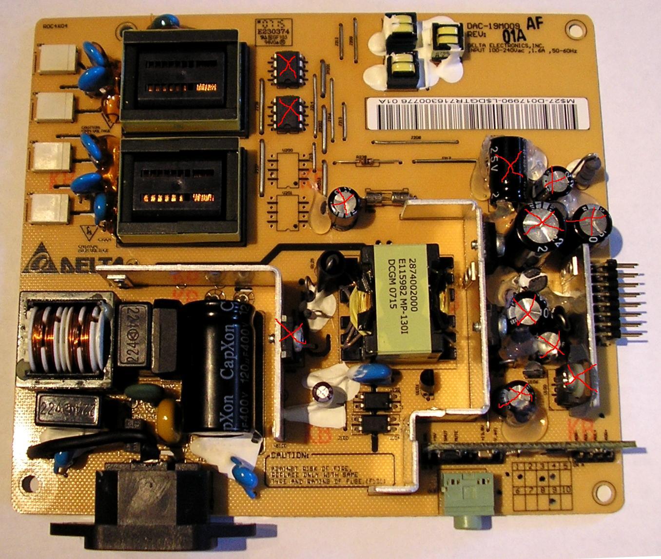 Now I am hoping someone out there can help me with this problem. I have a Viewsonic VX2235wm 22” lcd monitor that stopped working just the standby led nothing else .Reading through Badcaps.net forum found other people with the same or similar monitor with different problems . I took the monitor apart and looked firstly at the inverter power board and saw that the power transistor was blown (ST TIP122)replaced it with the same value and specs as the original except couldn't get the plastic insulated one so compromised and used a gasket between the heat sink and the body of the Tran. I tested the monitor and now the blue power light goes on and the screen blinks for about 4 seconds and then a black screen and the power light goes to standby orange. I then went through a process of elimination replaced the 8 caps still no change then replaced the 2 MOSFETS (AOP605) near the coils no change then I replaced the MOSFET (ST P10NK60ZEP) as it looked a bit suspect still no change. I have measured the voltage to the logic board and I get the 14 and 5 volts as the pins state. I must be missing something it wants to fire up .Attached is a pic of the board with the red X on the replaced parts.Can anyone help. Thanks