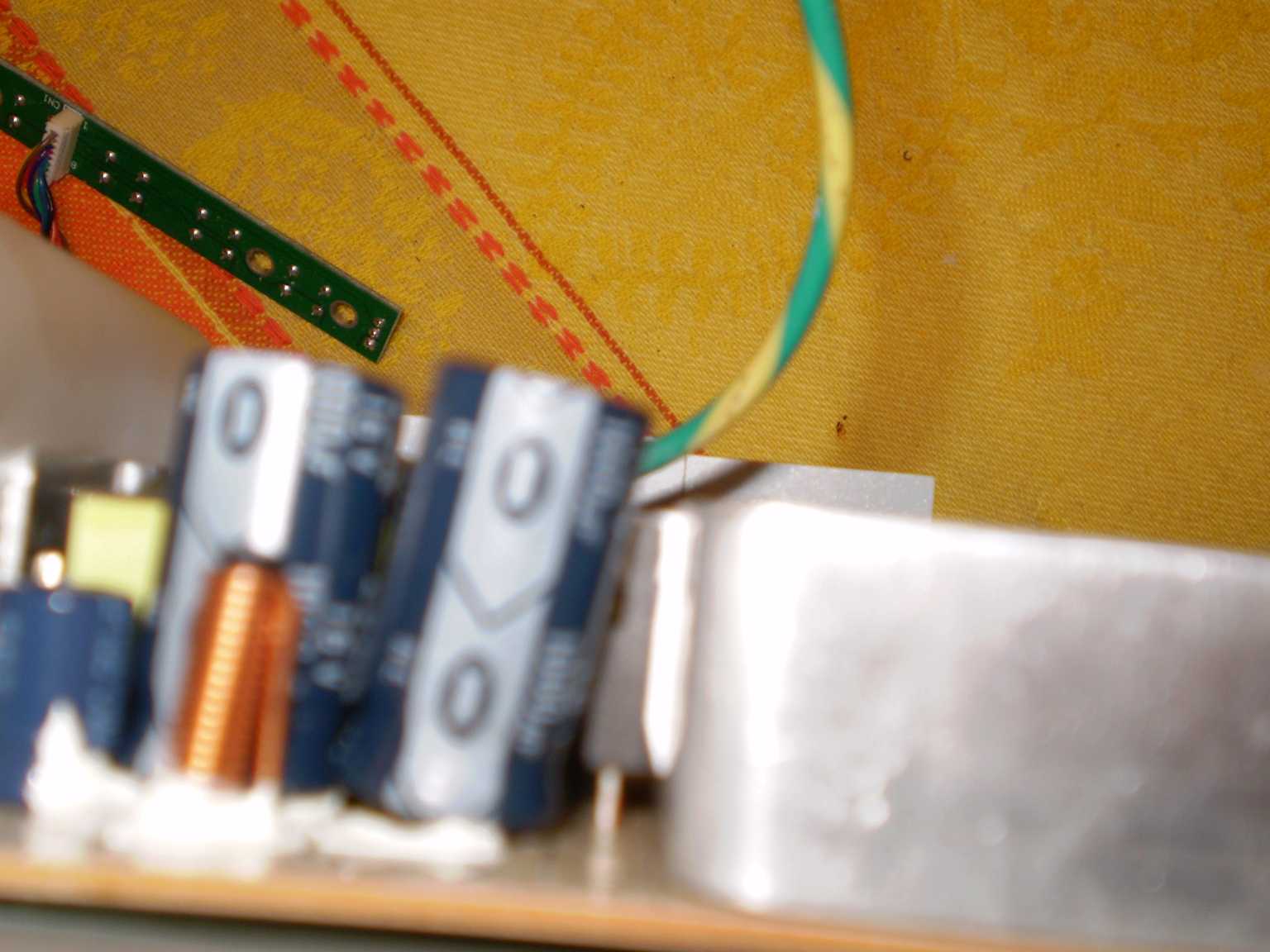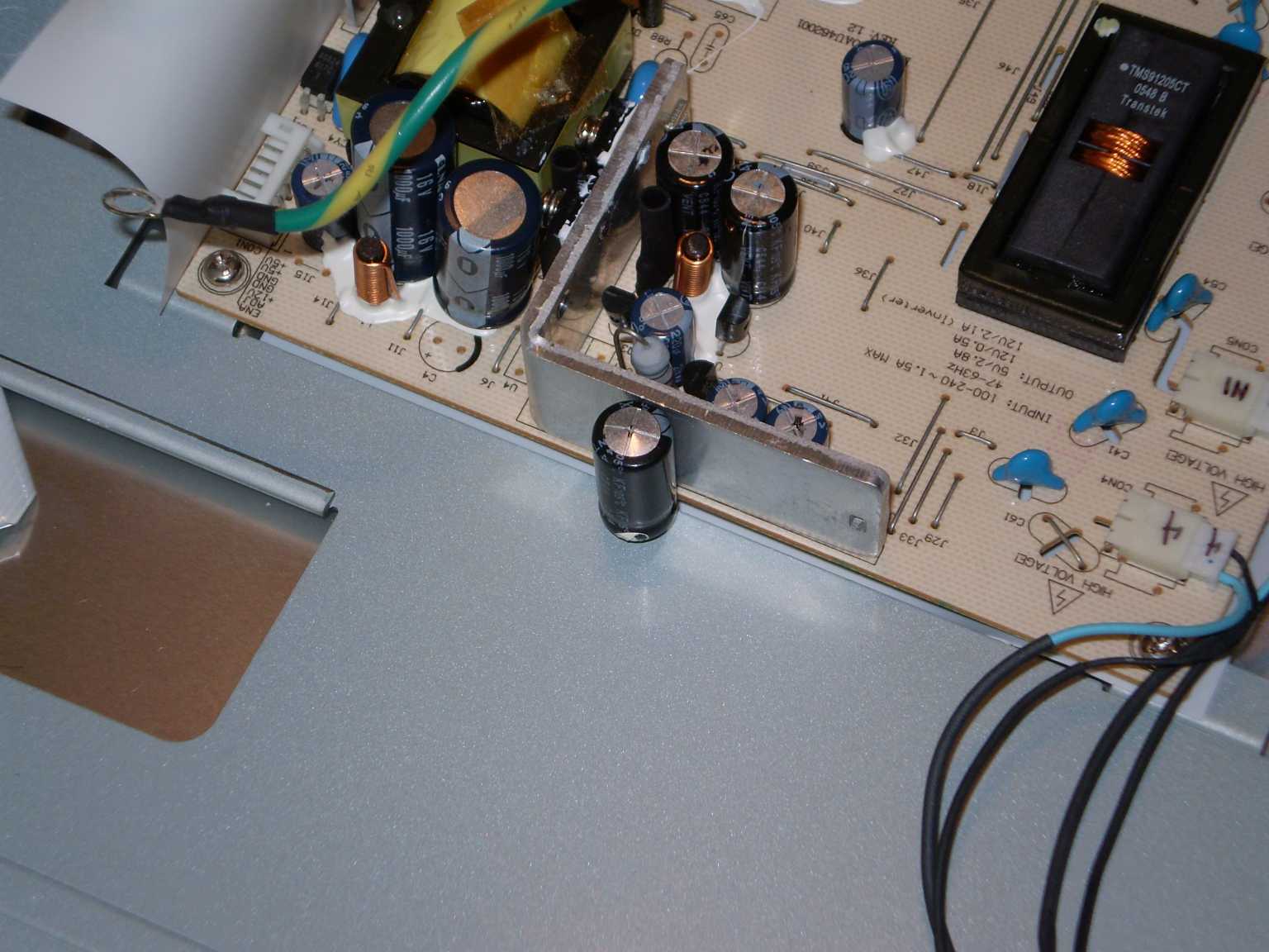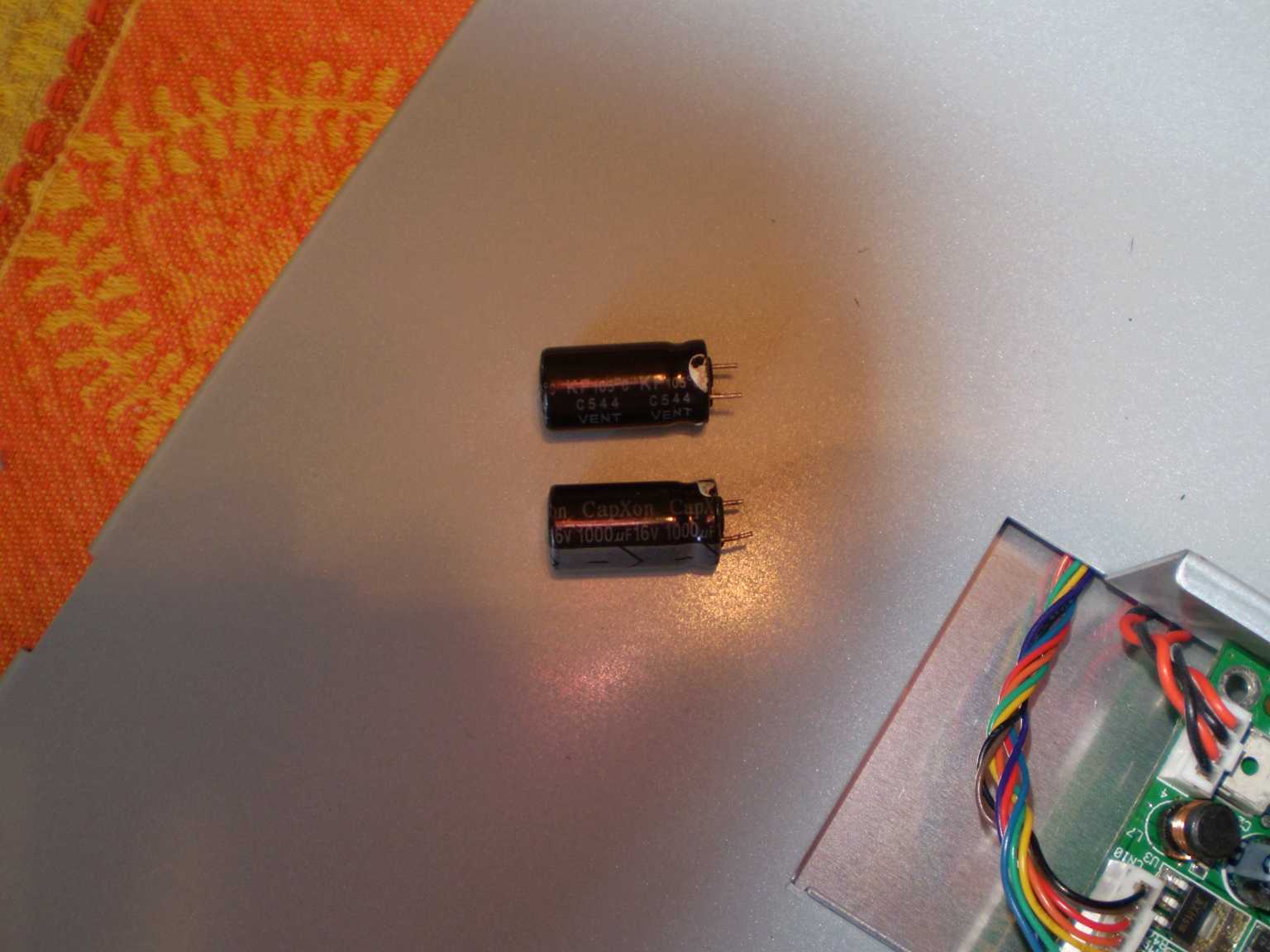 7. pulled the 2 bulging caps off the board (power inverter)tried to replace them with 2 of equal value but they are larger then the ones pulled off the board.