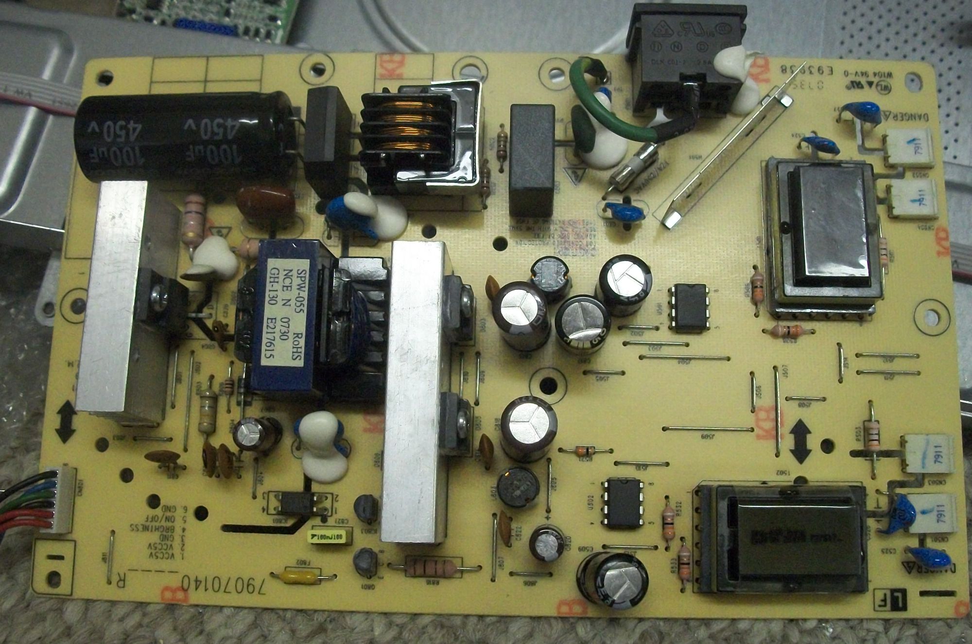 I found one of these monitors in the recycle box plugged it in and nothing. No LED or picture. I opened it up and found two bulged caps. Replaced all caps & put the boards back on the display and hooked up both power and VGA.