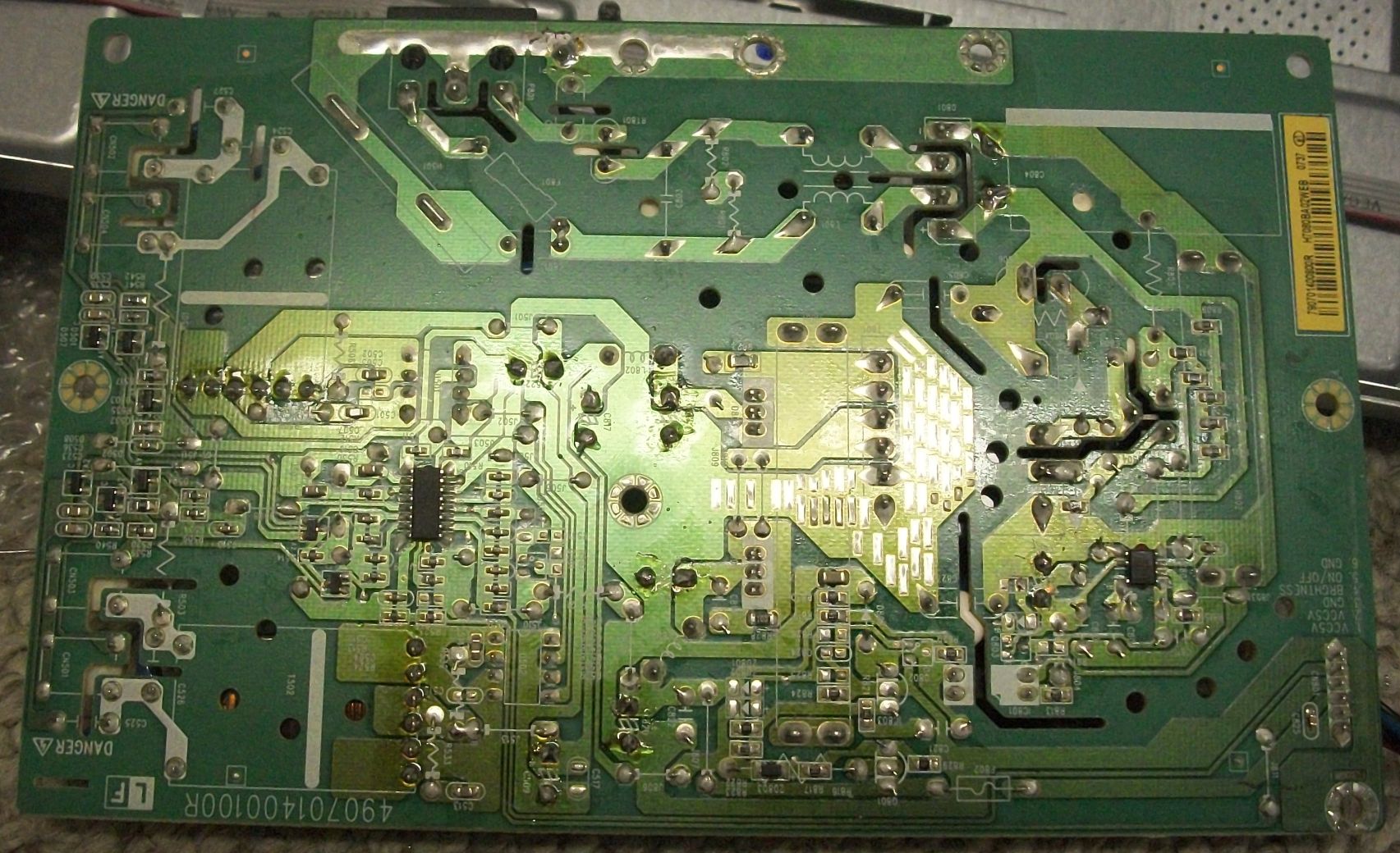 Before putting the power board back together with the video board and screen I checked the two fuses which were good and the voltage on the large cap (173v) and the bridge rectifier also (173vac) I tried checking voltage at the connector between the PB and Video board. I could not get a reading on the two 5v pin or on/off pin or the other pin (brightness) (6 total) last one is ground all read in the mv range and those readings were bouncing around.
