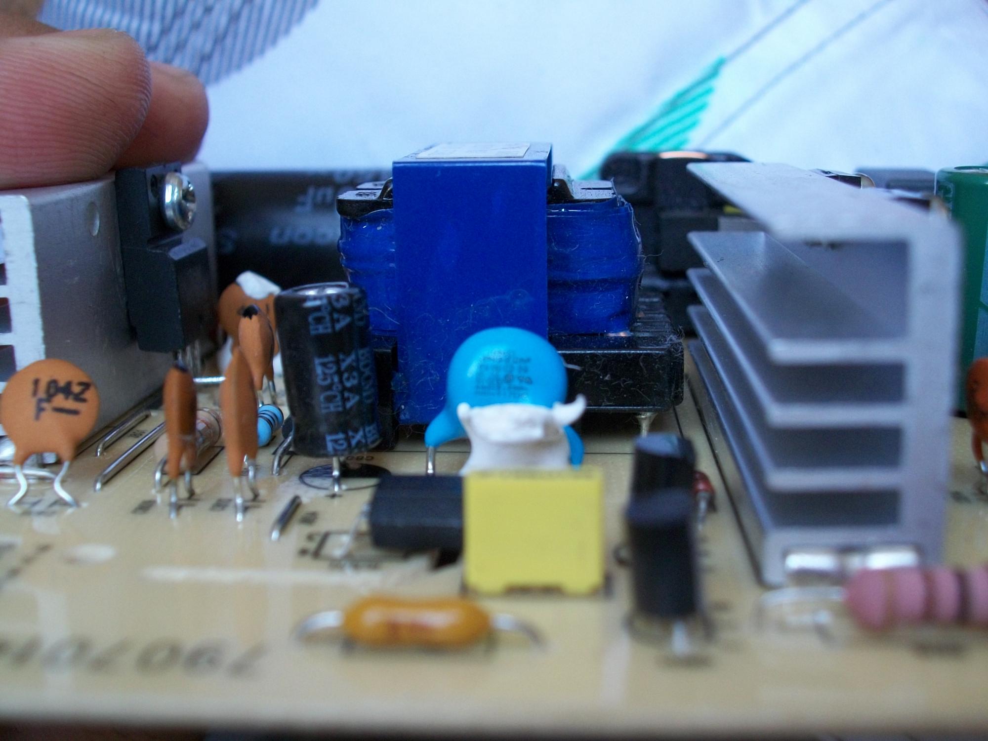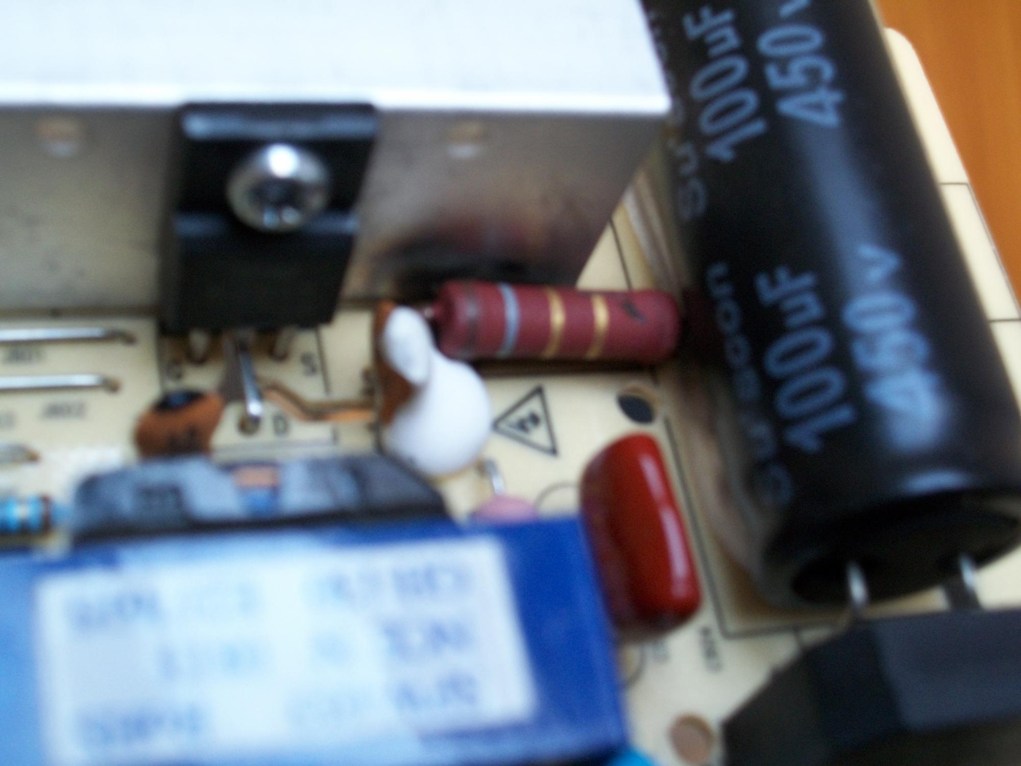 Test the FET on the heatsink for shorts (ohms, power off). The FET is above the big cap. It is marked S G D.