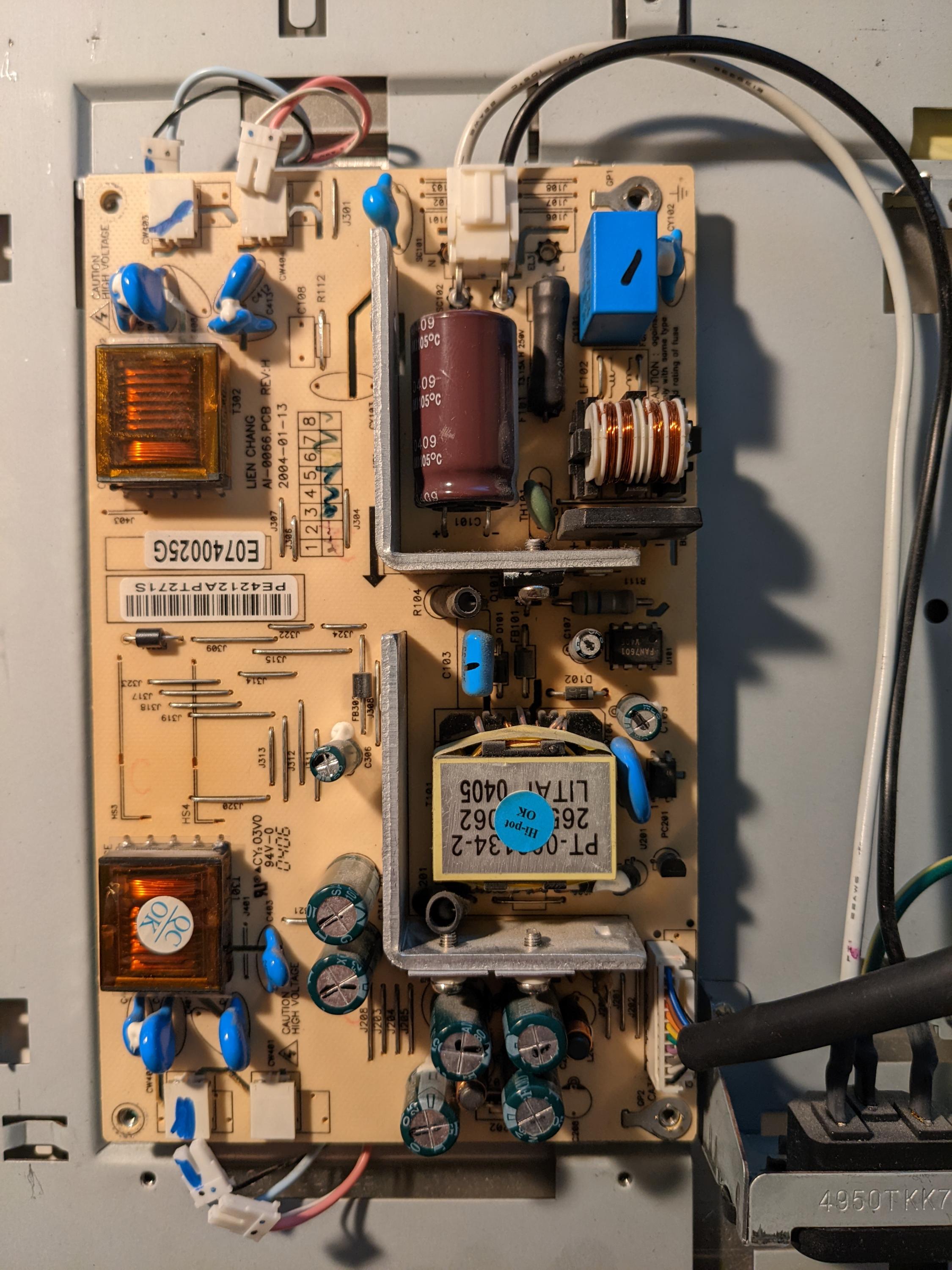 I have a LG Flatron L1910S that is dead, no led's no backlight nothing.......I took off the back and took a look at the caps, all appear to be good, although I know that's not a true test......I took voltage readings at CW301, Without the main board connected, Im getting 5vdc and 14vdc, WITH the main board connected, Im getting 4.13vdc and 16vdc. Please see pictures for details, I think the attached diagram is correct for the SMPS. Any thoughts or suggestions where to look next....I can send better pictures and take measurements if needed.