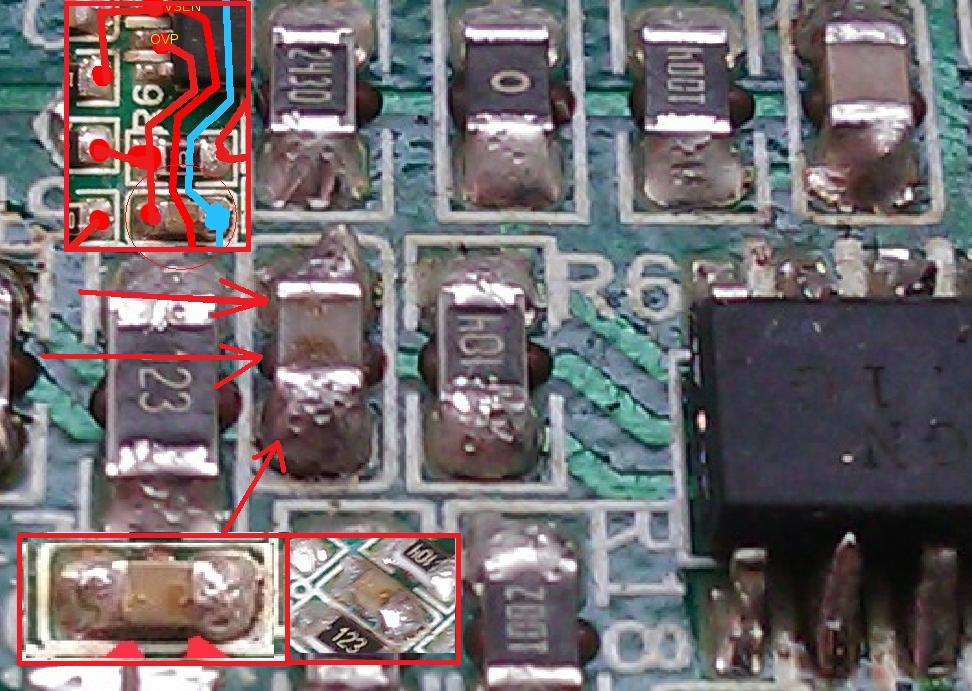 You bring up a very good point. Q22 appears to be SMD code RKM; Q23 certainly is. That is a RK7002 MOSFET. Because of the way it is wired, it certainly changes the voltage on the OVP input of the controller. Because of the tests you did with jumpers we know that reducing the voltage on the Vsens input will prevent shutdown.