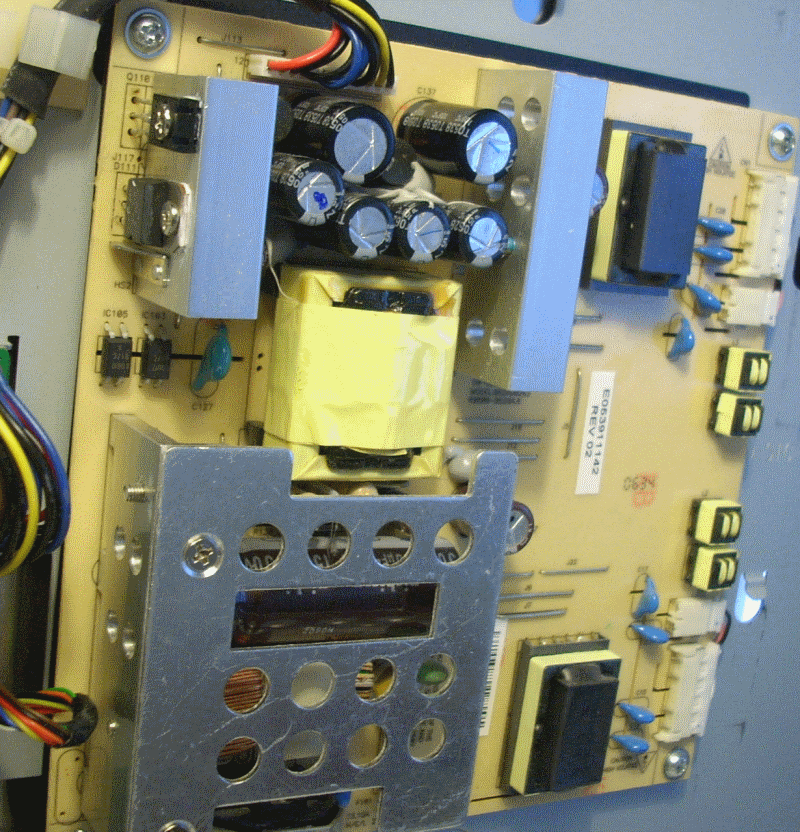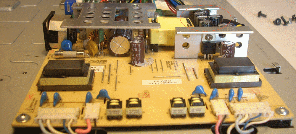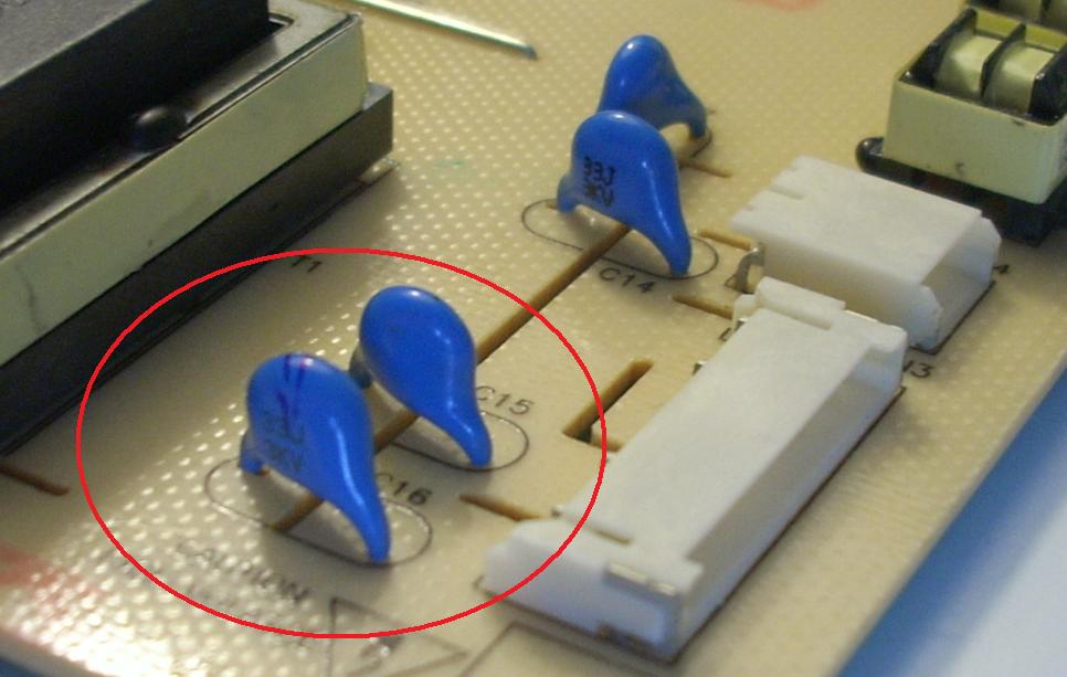 Problem must be on inventer board as image is still there. So I visually inspected all capacitors, they seem to be allright, could it still be a capacitor issue? Or could it be a dry joint?