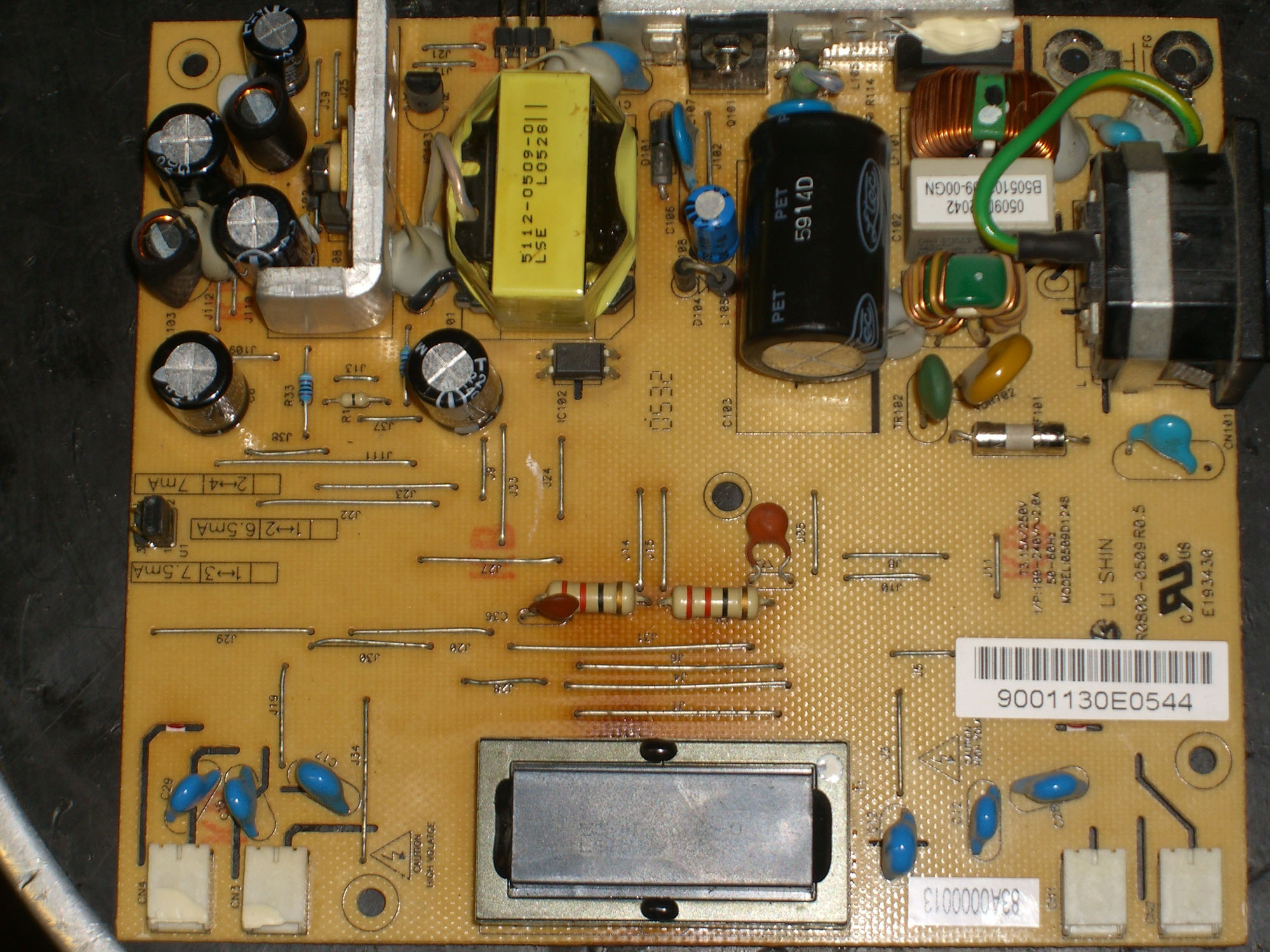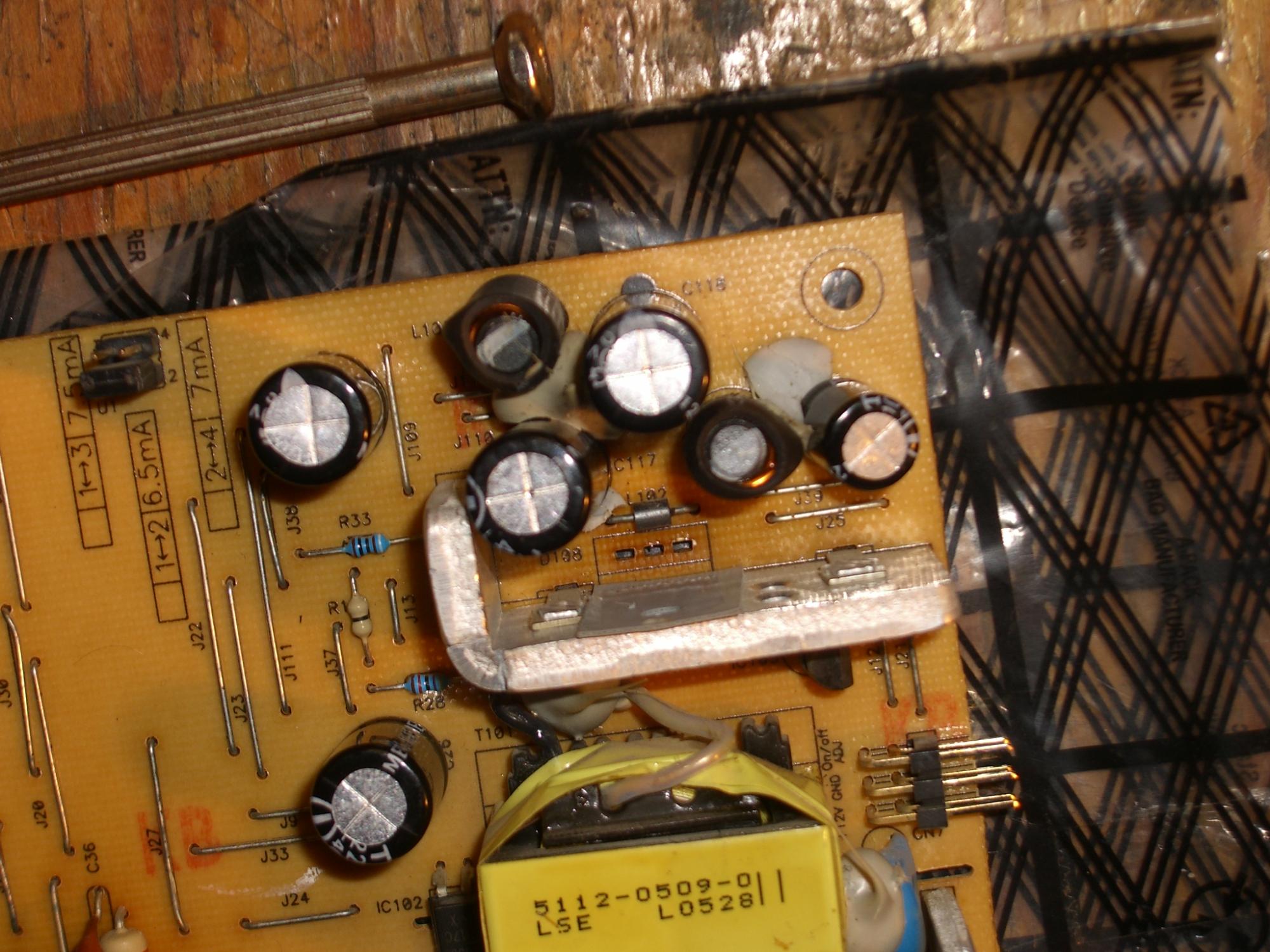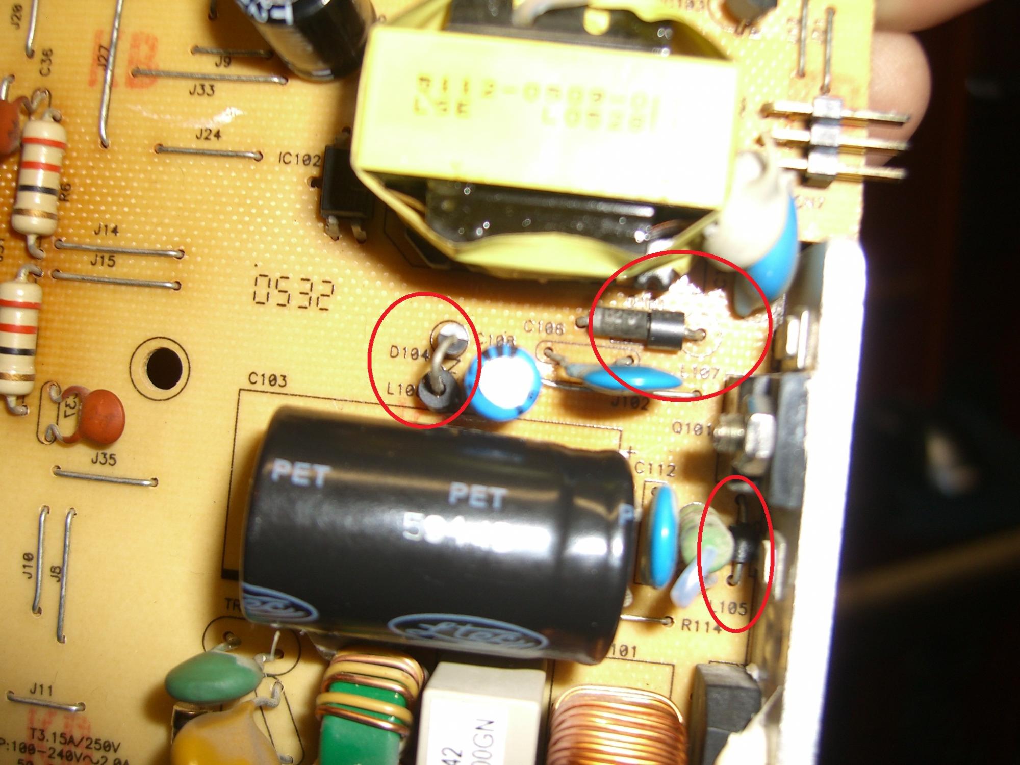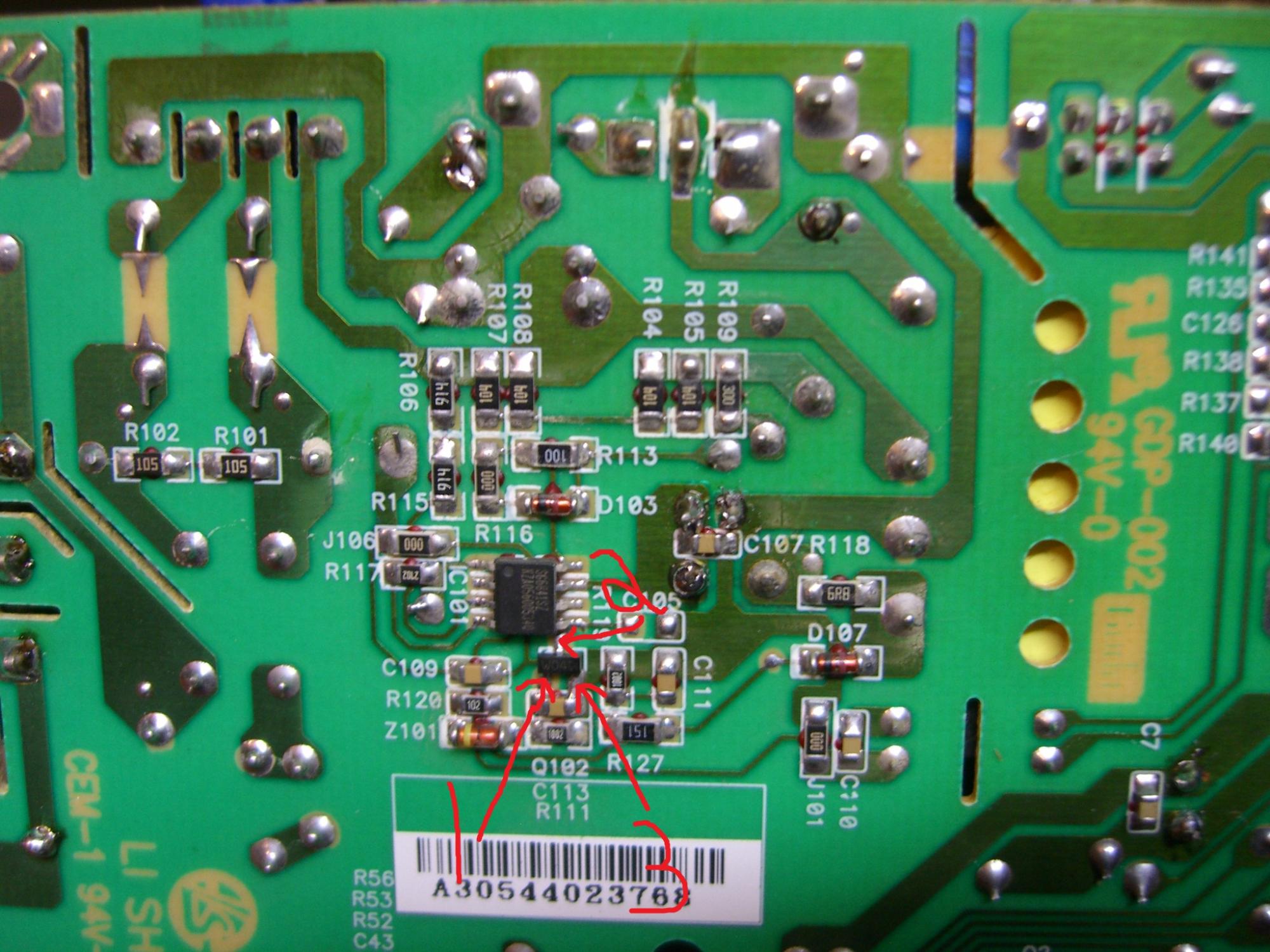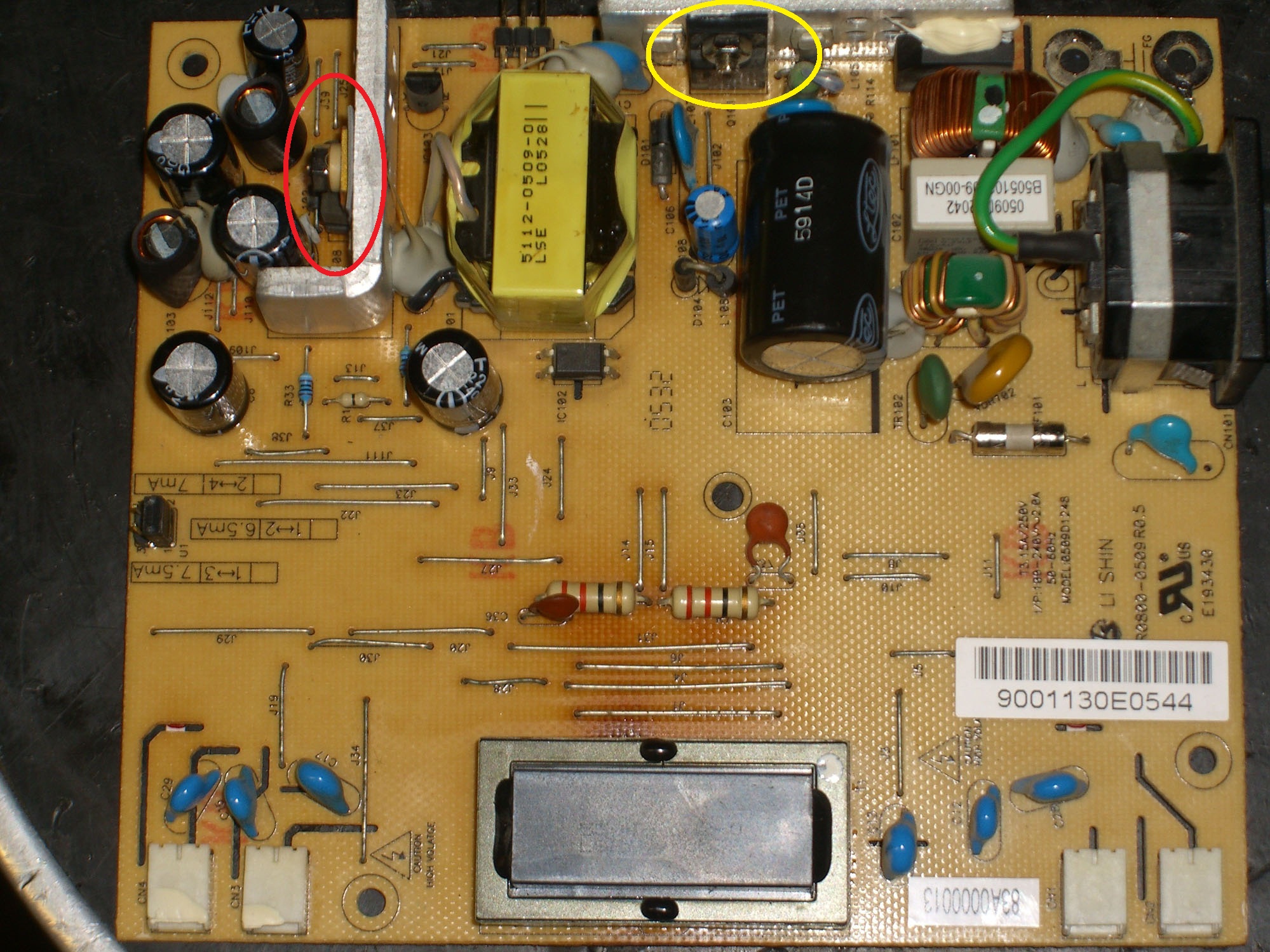 Okay, it looks like Q102 is a general purpose NPN transistor, PMBS3904. Spec sheet below. Pin 5 of IC101 is basically used to shut down the power supply in case of over temperature. Since a thermistor is not being used here like it is in the pdf schematic, the temperature function is not being used. From the IC101 specs, it looks like pin 5 has to be held at above .65 Volts to prevent power supply shutdown. Once it drops below .62 volts the supply will shutdown. With the monitor on can you measure the voltage of pin 5. If it's going below and above .62V, shut off the monitor and perform a short circuit check on Q102 using the numbering config on the spec sheet and retiredcaps instructions at this link: