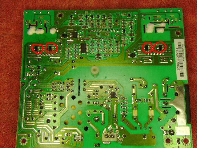 Can I chime in on this thread? I have this same monitor, same issue, and my power supply board looks the same as well, with the same "burned" inverter on the right. If you look back at the very first picture he posted, the "white Box" on the right side has dark discoloration around it, and then the back picture on the left (where the white box now is) has a "circle" area of what appears to be a burned area. Mine looks just like that, and also on this forum somewhere I read that to test the ohms at the diodes on either side and you should get 750 ohms on boths sides, and if not, then one is probably failed. I did that test and I got 745ohms on one side, and 9 ohms on the other. The burned one, obviously game me the 9 ohm load. SO, none of my caps looked bulged at all, which I was disappointed to see, (hoping for an obvious quick fix) so, do the transisters sound like they would be the problem?