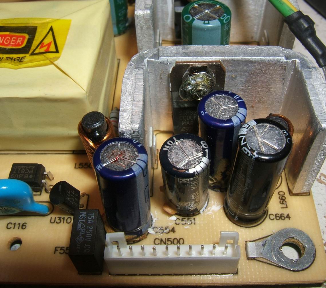 Here comes service #3. It's my monitor so the many service attempts is educational and not a problem. This time I was using it when I heard the cap pop. The monitor continued to work. I quickly open it up to see that the Ltec C552 has blown. Better caps are in parallel which allowed the monitor to continue working. Heat sink HS550 and all the caps inside it were very hot which is why this monitor eats weak caps faster than your average electronic oven. Only very high endurance caps should be used. Up to 20mm caps will fit. Taller caps usually are higher endurance so the taller the better. Here are some high endurance caps.