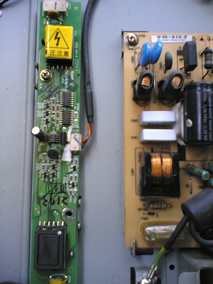 This is lcd that i bought dead hoping to repair it easily like another i had before, but i'm unsure, when i push on it stays green with led and no image no b.light, i notice a bit of activity on the screen only when i sw. off infact it has no dark image but there i see a rapid 'white' screen (with lamps off), i opened it and found to the right in zone of inverter card a little sign of dried liquid and a corrosion on a screw, sob!.. apart this the inverter has any sign