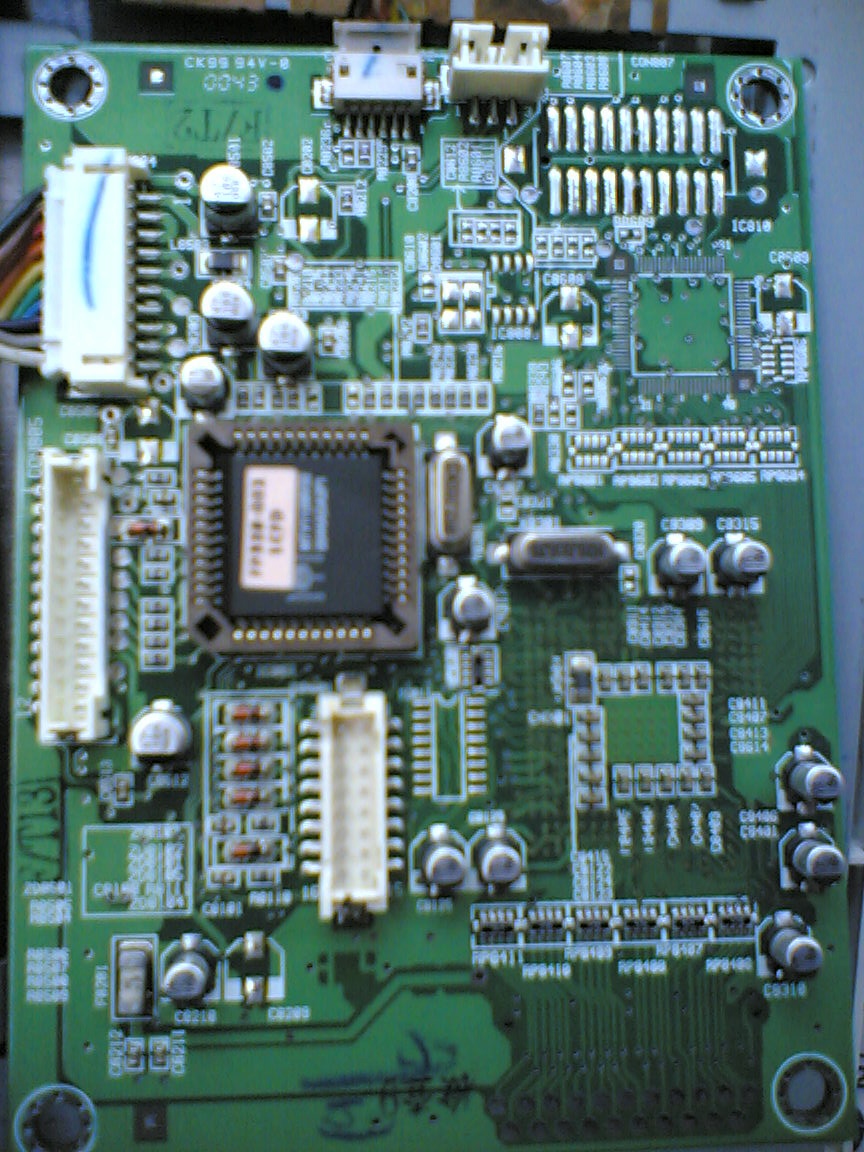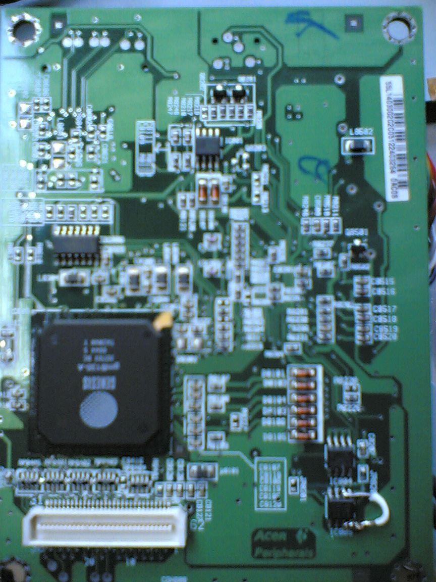 of liquid passing, the voltage come to this board, 12, 5 and 1,4 v, i suspect a problem in the video card, infact psu work well, in that instead there is a white smd fuse that has no potential on its terminals, fuse ok, it go to the panel connector, probably to power it, on the other side of the fuse, before it, a 8pin sop smd chip that has 4 pin in a row connected together, 3 other in a row together and 1 lonely, seems a mosfet, it has on the gate approx 5v and the 'maybe' source (3 pins) also 5v, in drain approx 3v that go down whenever i test it. I wanted to know how to force the b.light on to test it,