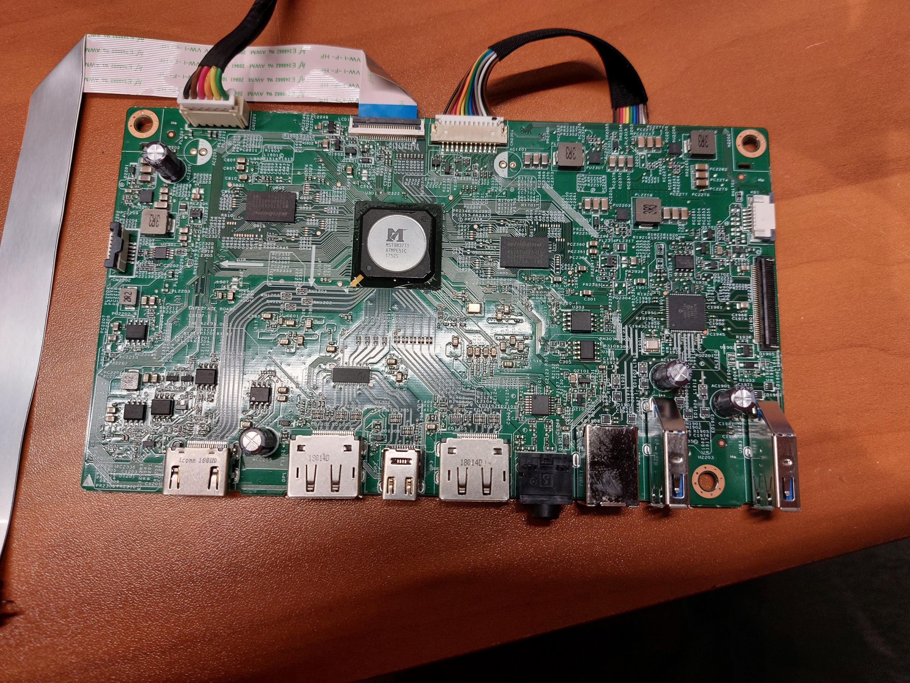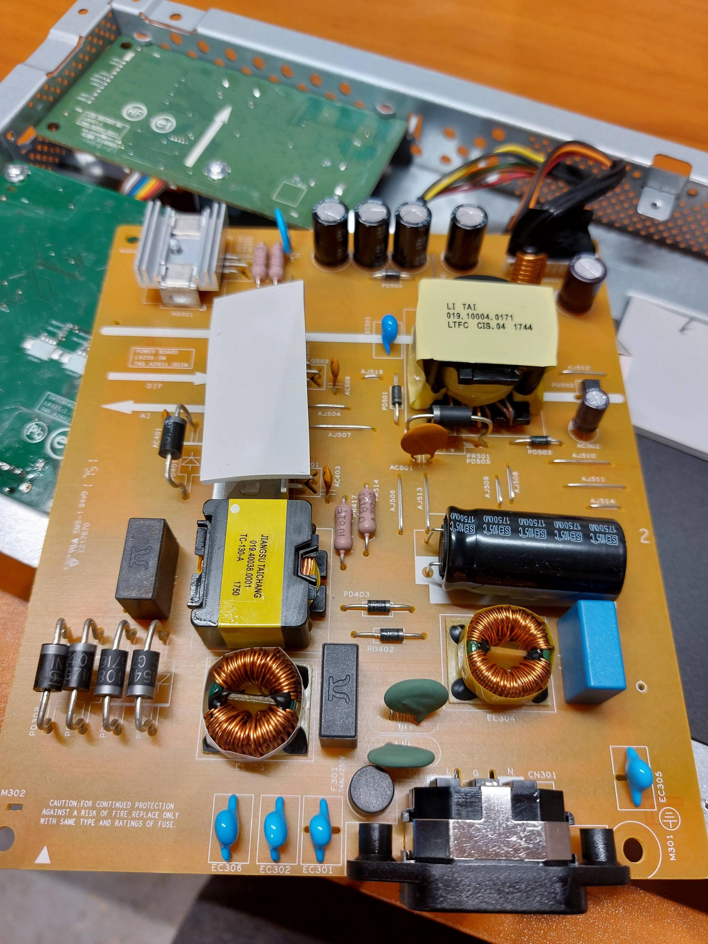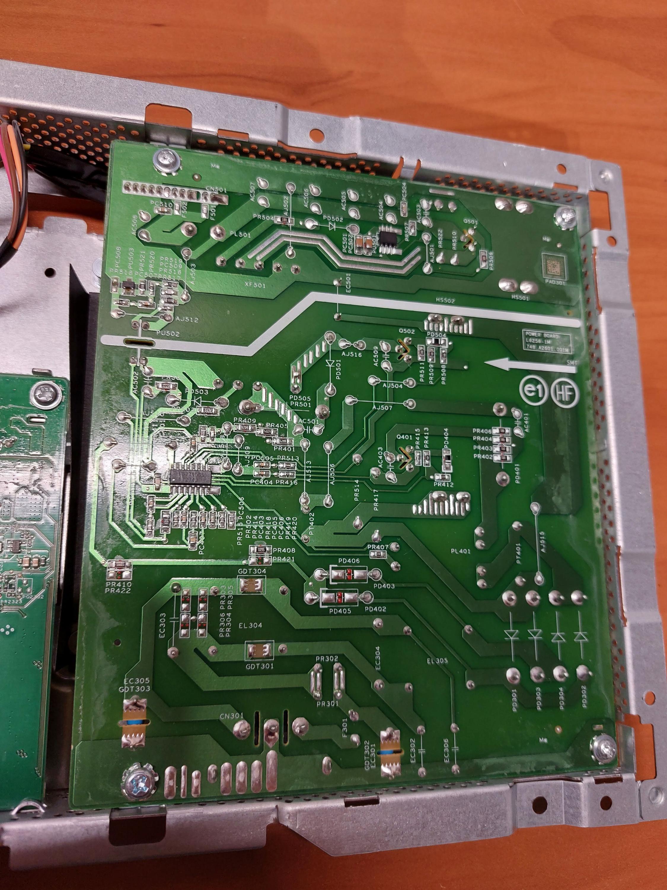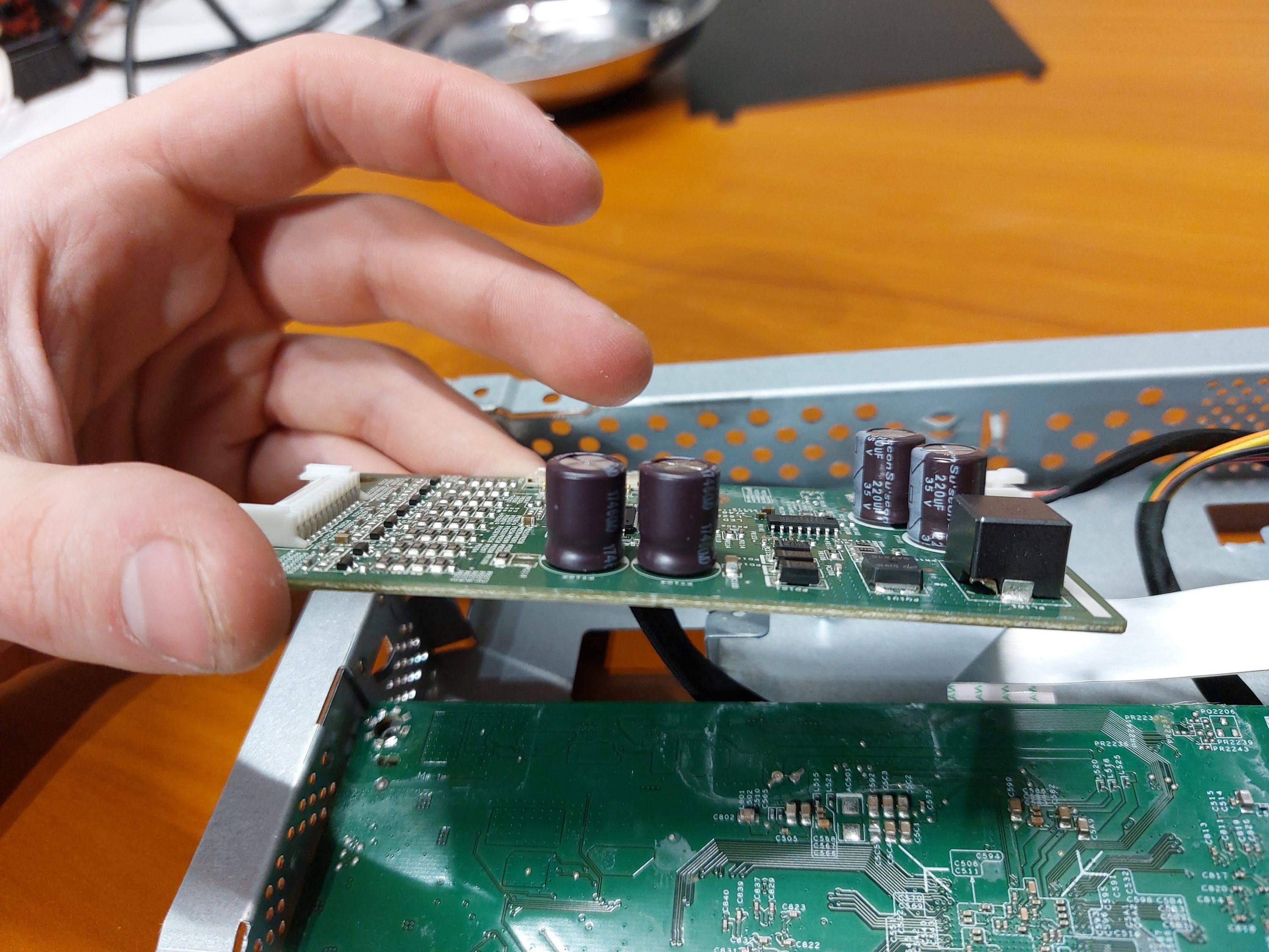 I dumpster dived a 1440p Dell U2518D screen the other day and figured I'd take a crack at fixing whatever issues it may have. I powered it up to find that even with no signal input the screen flashes rapidly when turned on and has vertical lines across it. I disassembled the monitor and took pictures of the 3 circuit boards inside it along the way.