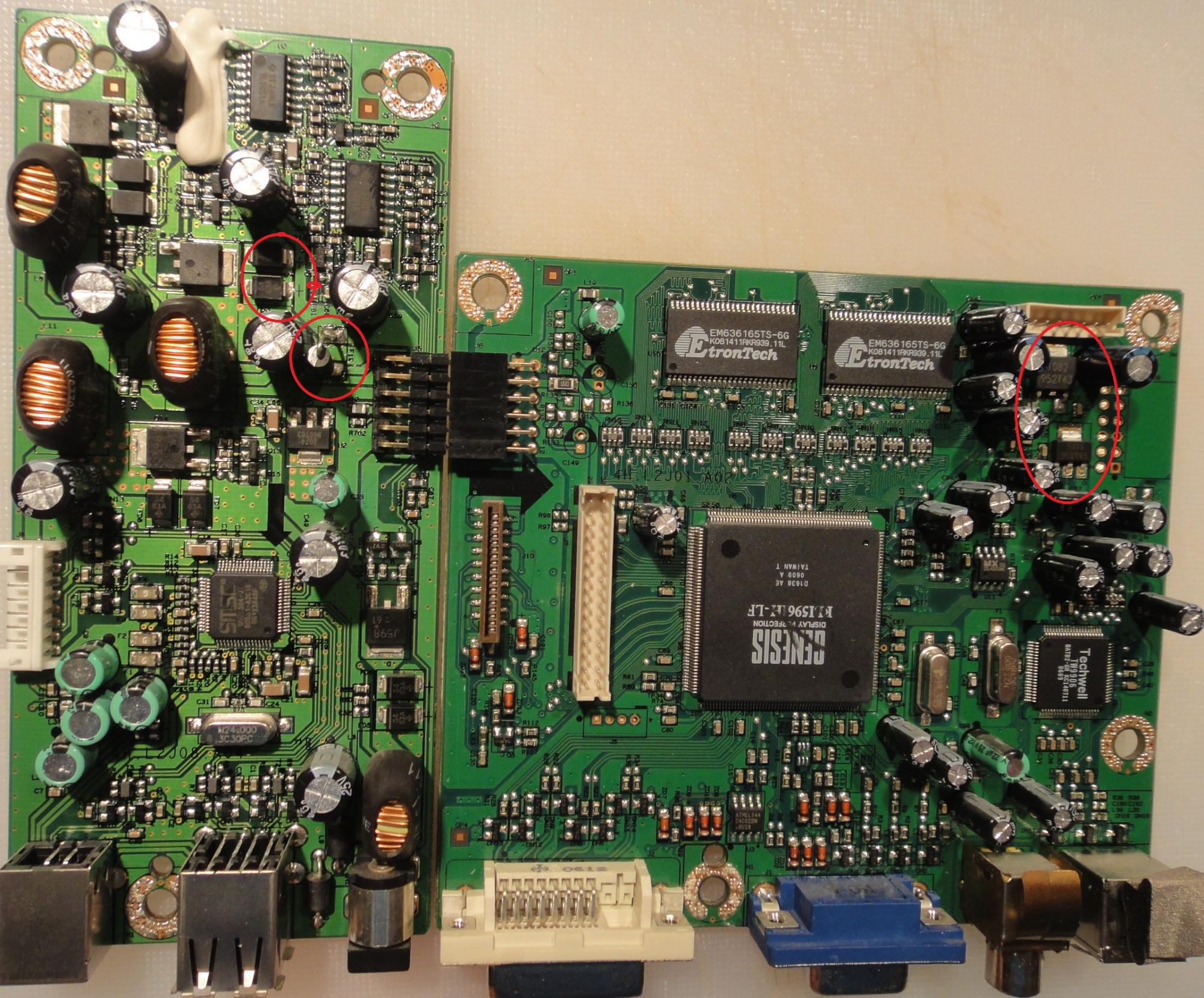 I have 2 monitors with same problems. I take off FD7-8 diods and test it without circuit - it work properly. Between diods pads on textolite are the same 1000-1200 ohms. Then i take and tested U2, Q14, C60, C44, C66 without circuit - it's all look properly.