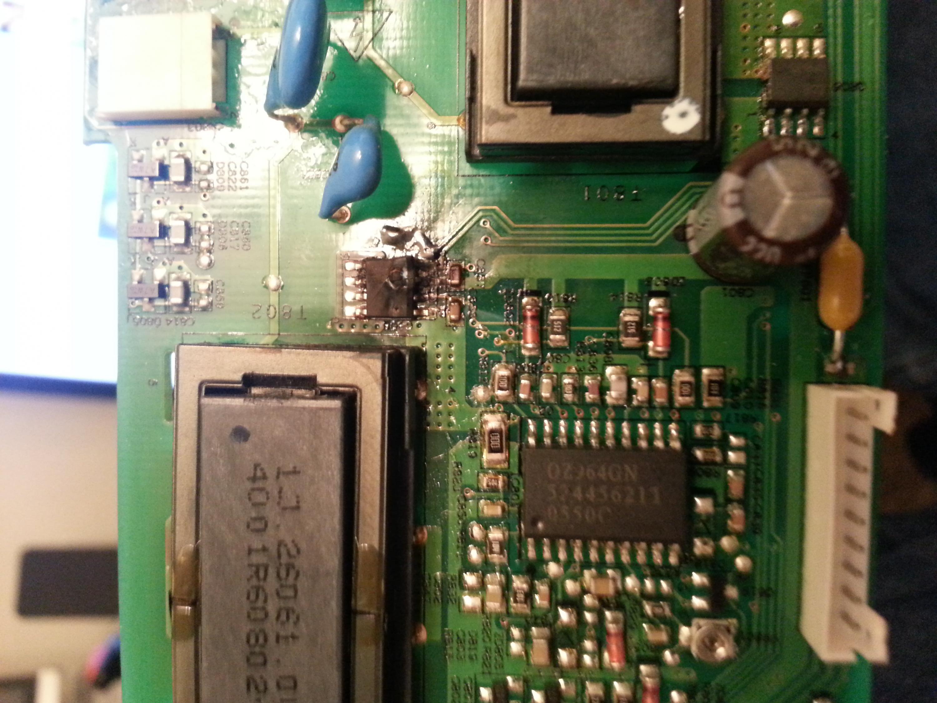 I disassembled it with the intent of finding out just exactly what boards were bad in the original monitor. I first connected my original LCD to the new parts and a pc. The screen worked fine. I left it in place. I then put my original power board in place of the working one and monitor worked fine. And so on yielding the following. My original USB board was still bad, my original logic board is bad, but my inverter with the replaced blown fuse worked fine as well as my LCD and power board. Not to push the issue, I powered the conglomeration off. Then I got to thinking I might as well write down a bunch of voltages from here and there before replacing the new monitor back together so I powered it back on and for about an hour I begain measuring what I thought would be key areas which would help me later on. I was measuring DC voltages on the J5 connector on the USB board and documented them which correlated to other's findings earlier in this thread and was having a grand old time but needed a break. 15 minutes later, I came back and had lost my buck regulator voltages! First thing I checked was F19 on the new USB board and it was blown. But it gets better. ZD701 is now shorted (again), my 3A F19 is blown (again), the new Pico on the inverter is blown (again) and the only thing different than before is Q6 is not shorted. I don't know for sure but I fear the new logic board got zapped also.
