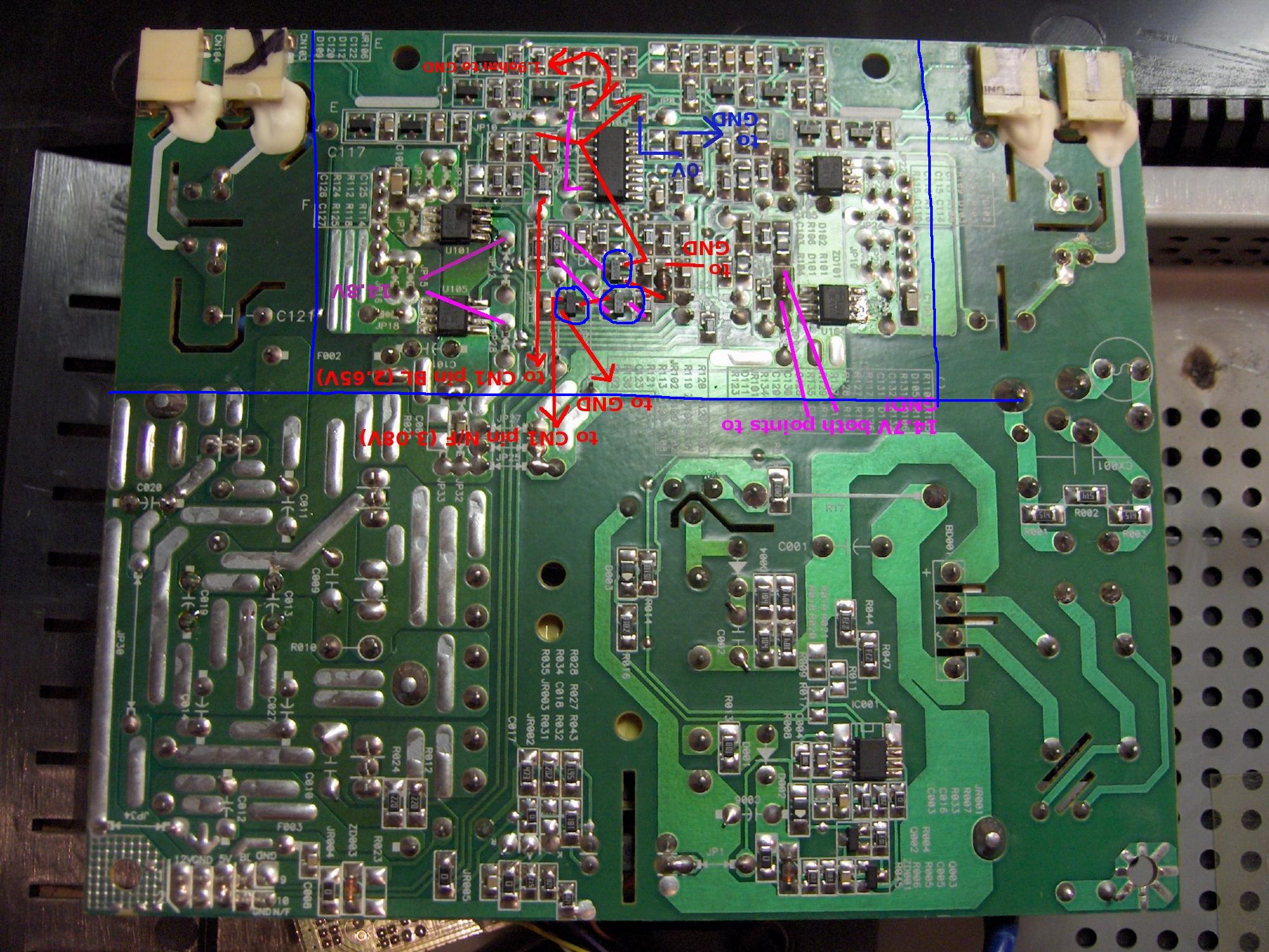 In my search for a proper 5v heavy ATX power supply, I selected an old Antec SU-380 that I've had in storage for a long time. Opening the power supply reveals a couple bulged capacitors. I removed all the caps and made a map for myself. I found the datasheet for the PCE TUR series in this thread: