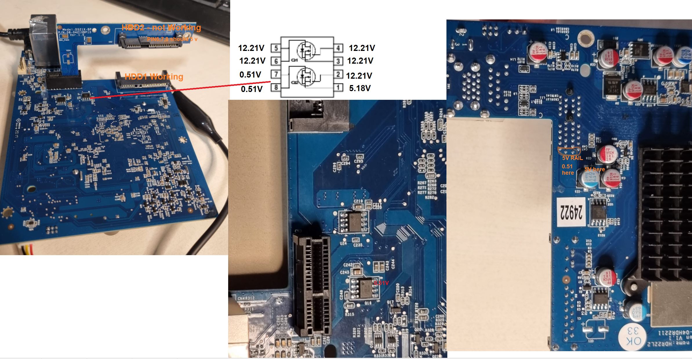 I could make jump from working 5V from HDD1 ? Or try to fix 5V on HDD2. i can't find any boardview or schematic