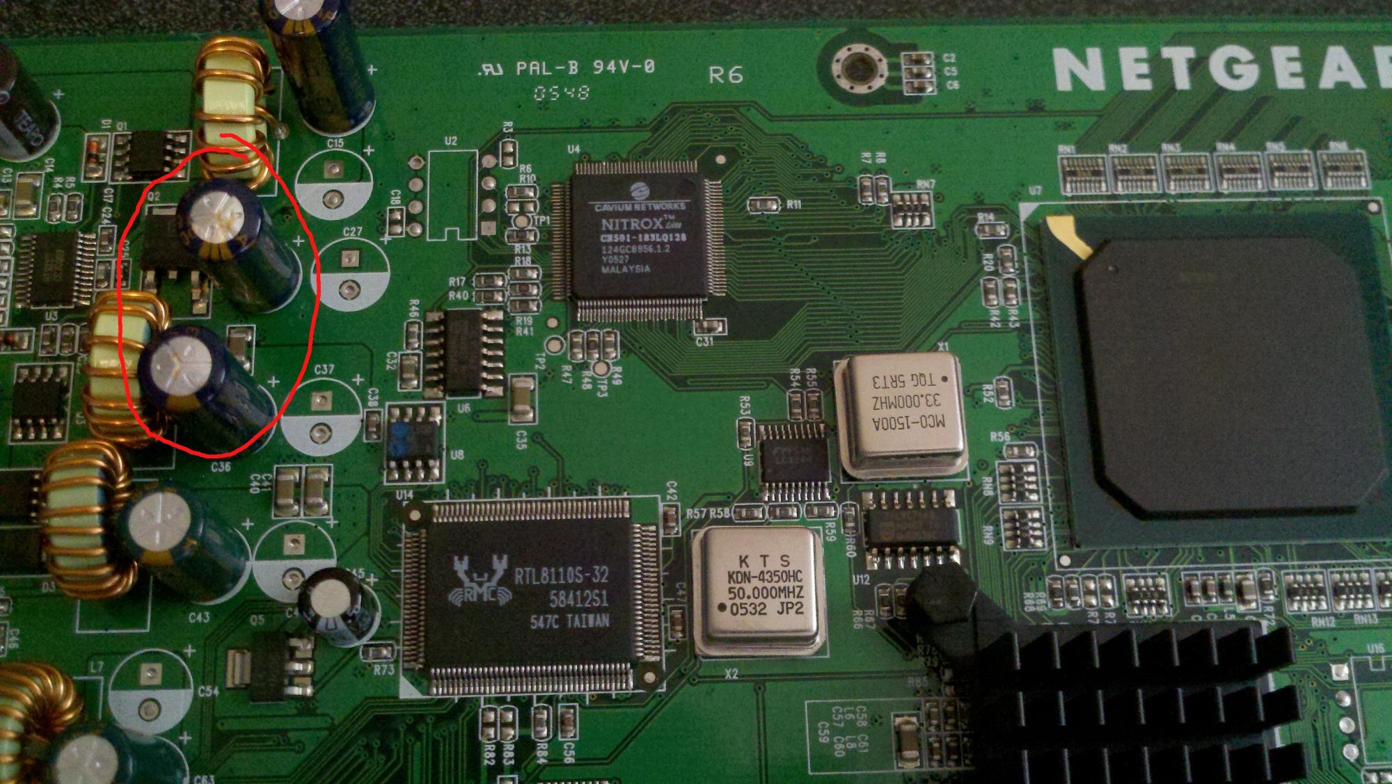 Just repaired 2 Netgear FVX538 routers with bad caps. Same caps bad on both boards. Original caps were 1000uf, 16V made by TEAPO.