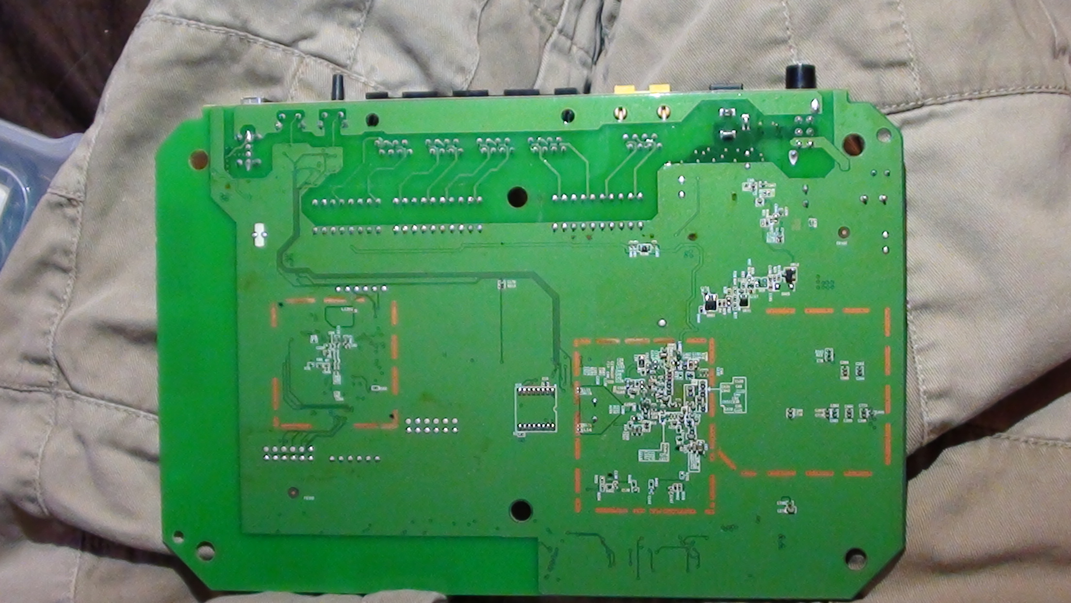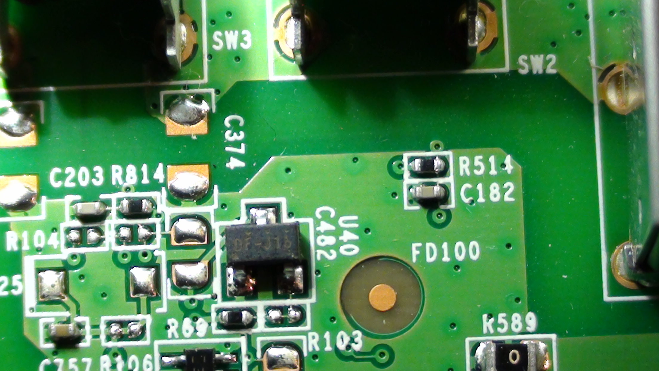 Anyway, I have taken it apart and identified a component that I think might be bad. It appears kind of burnt, I'm having trouble identifying it though. It's next to the button that allows us to turn the wifi on/off. It's labeled on the board as U40. The device has printed on it, DF-J16. Here's some pictures. The front of the whole board was hard to get a good pic of. I can upload multiple pics in sections of the front if needed.