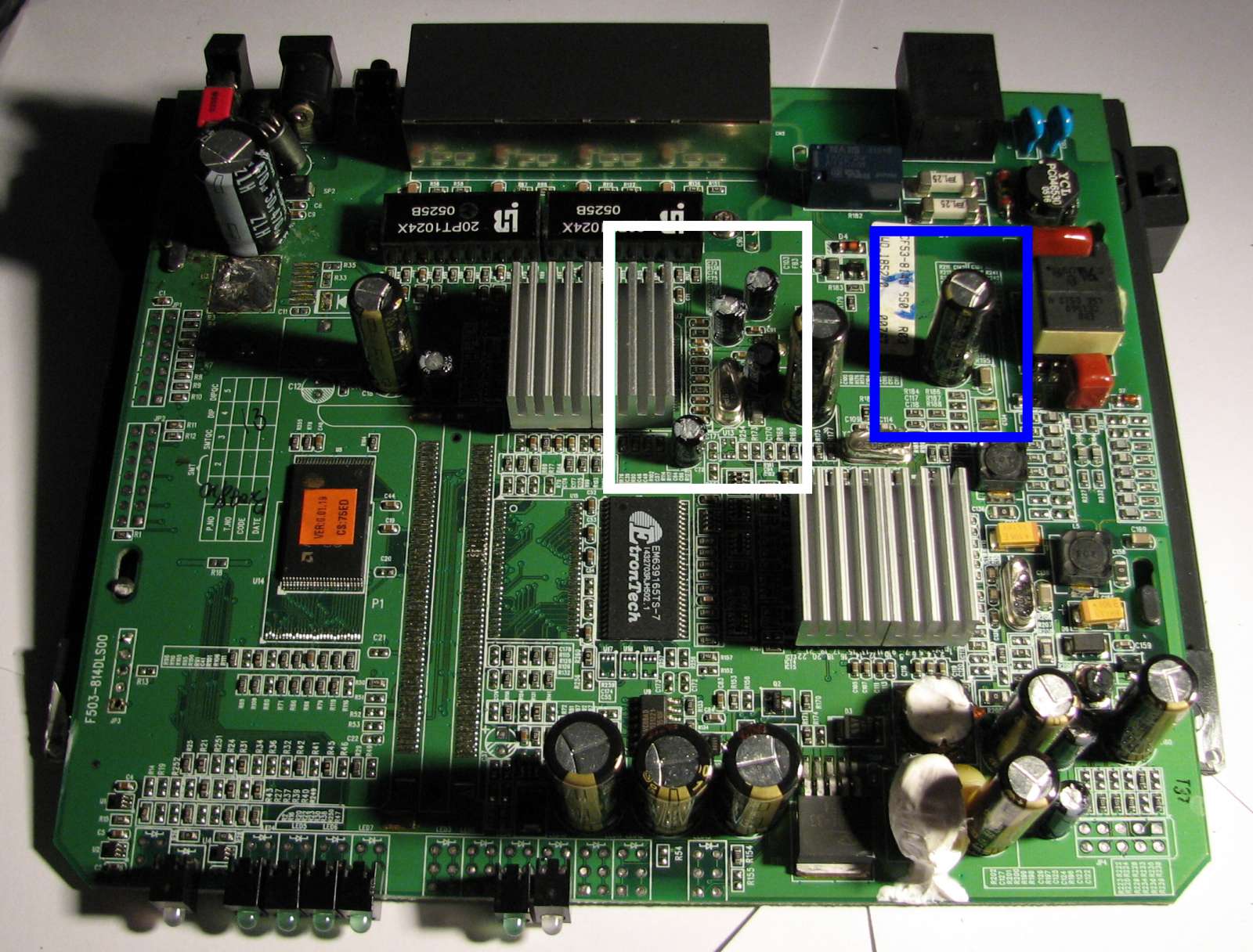 In the blue box I show what I feel is an important capacitor relating to how your internet behaves. Changing this for me was of great interest. I tried many different capacitor types here. I found Panasonic FM 16V 2200uF fitted nicely on it's side here made the internet feel smooth and fast. Also I used surface mount Oscon connected to Panasonic FM 470uF connected to WIMA 1uF, the internet felt extremely responsive (pages appeared instead of loaded /connected) with this particular combination of all 3 connected into the socket. A side effect of these combinations seemed to be more frequent PPOA authentication drops. After thorough testing, for conformity and stability a single fresh PFM470uF was inserted to comply with original specs.